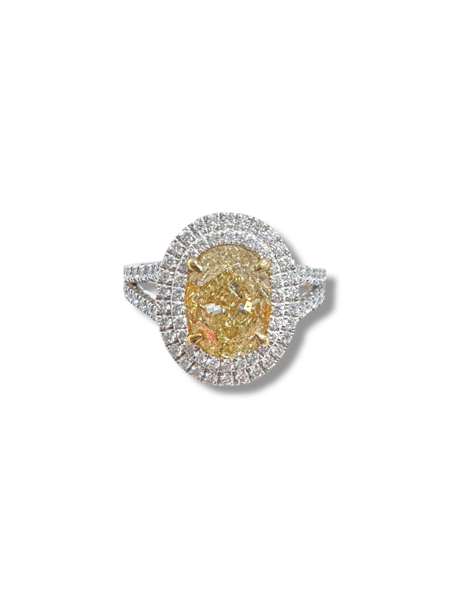 Fancy Yellow Diamond Engagement Ring with Double Halo and Split Shank Pave Band