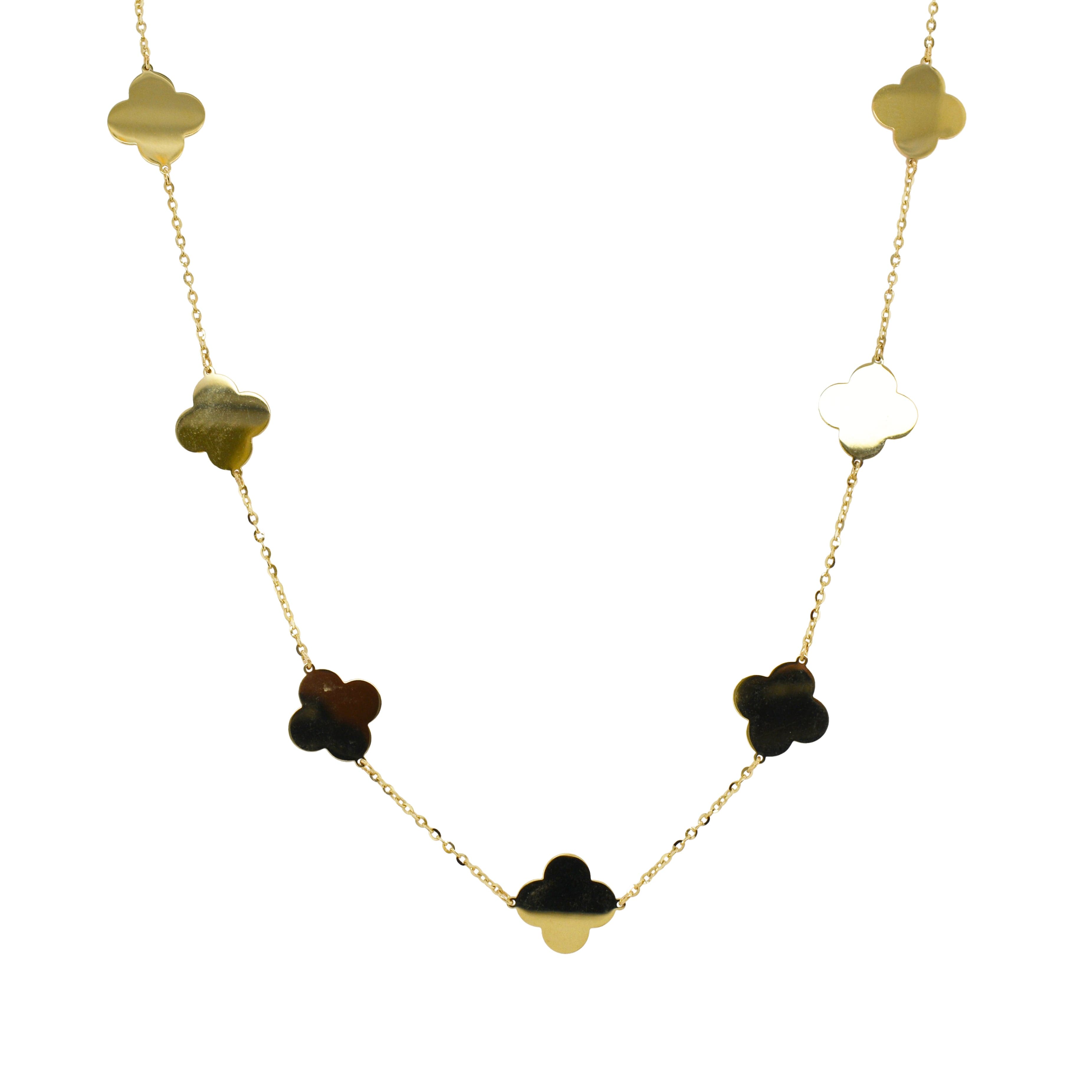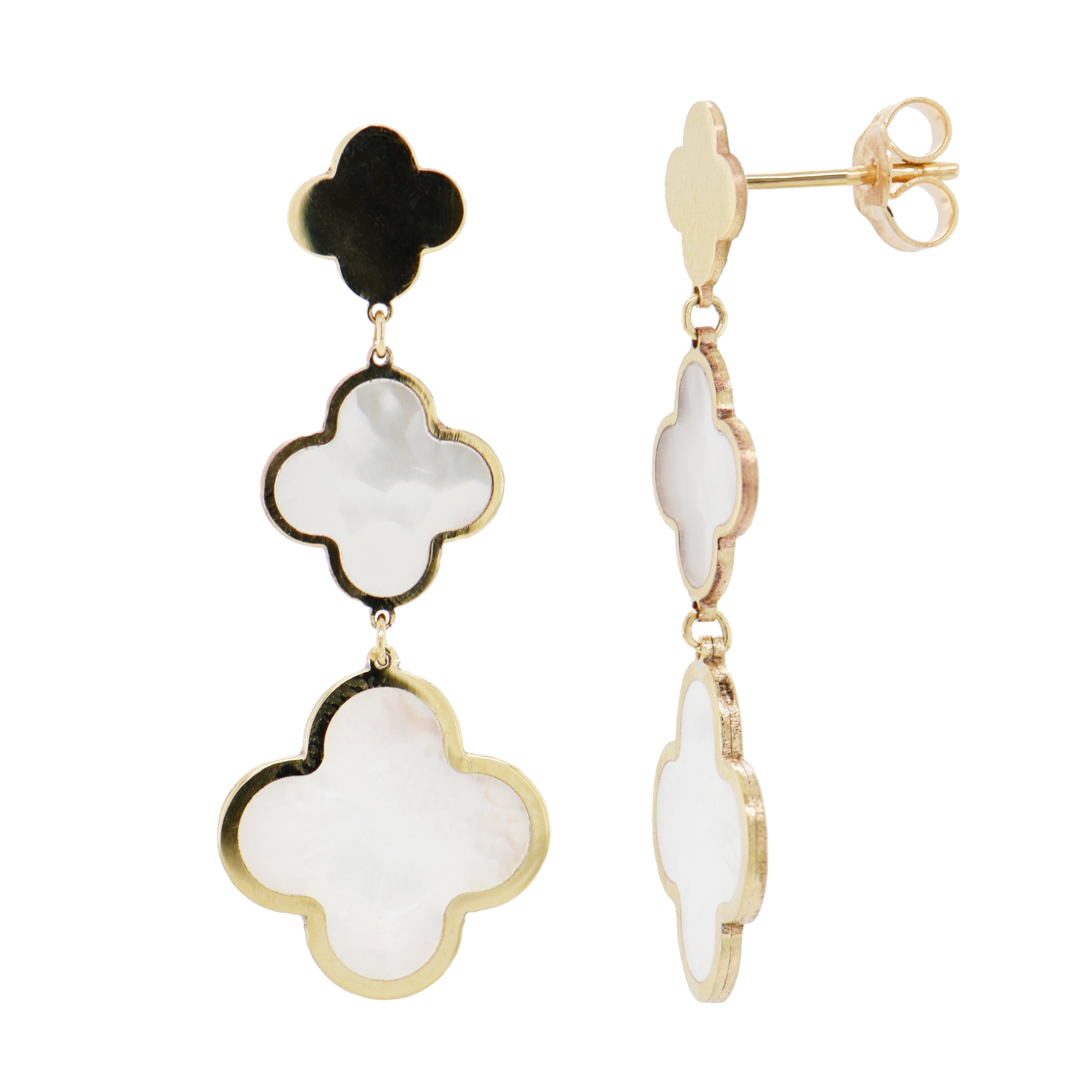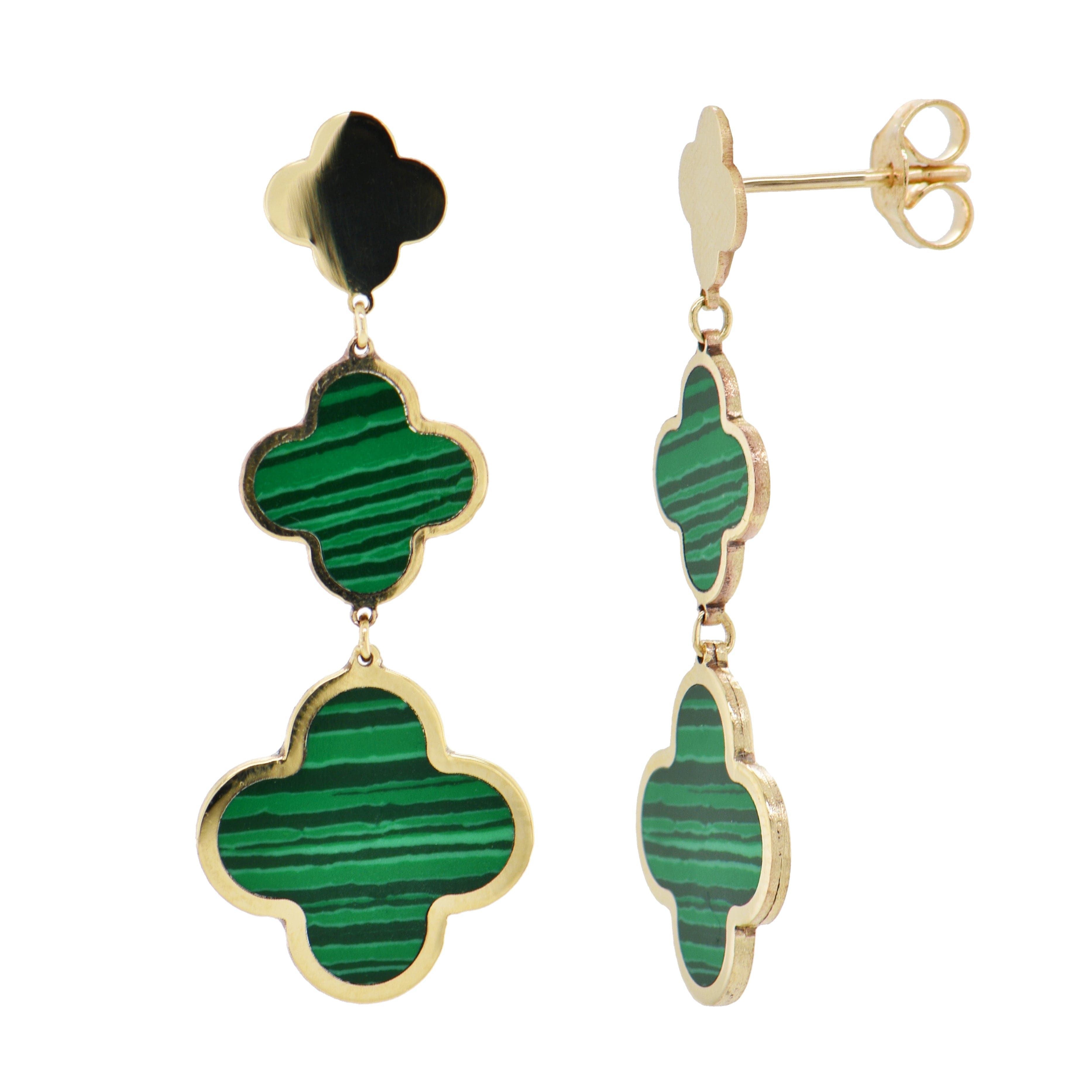 14K Gold Three Clover Gemstone Inlay Dangle Earrings