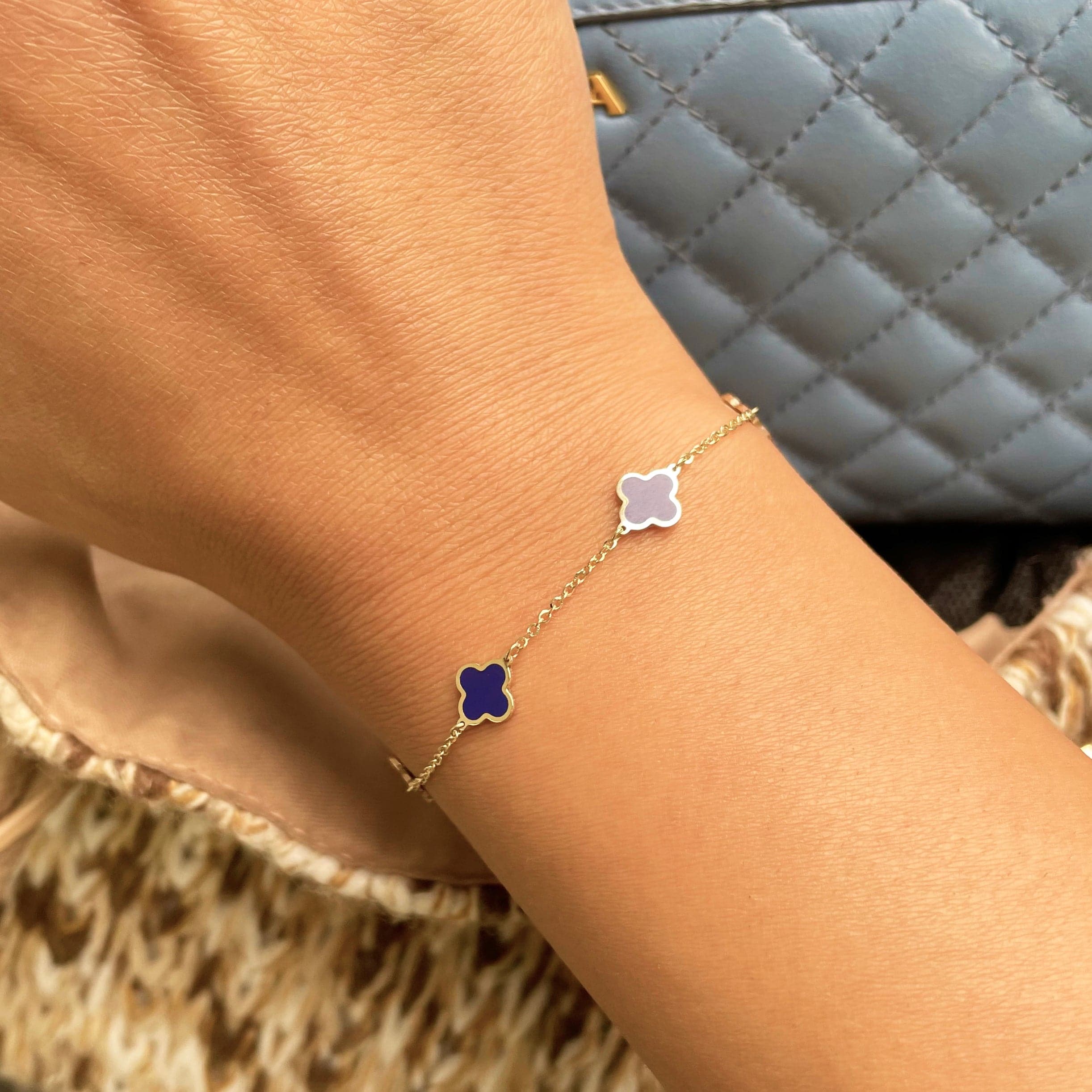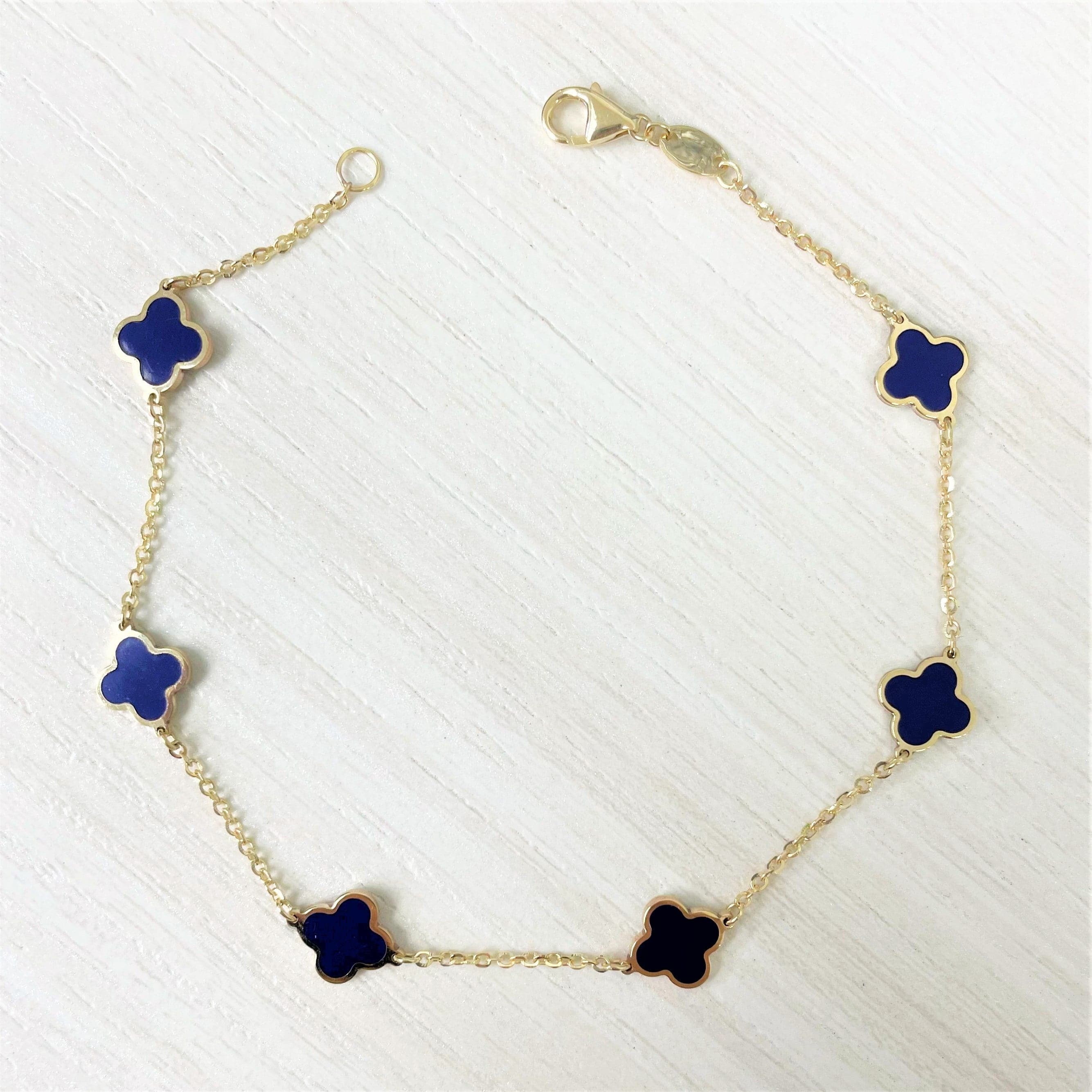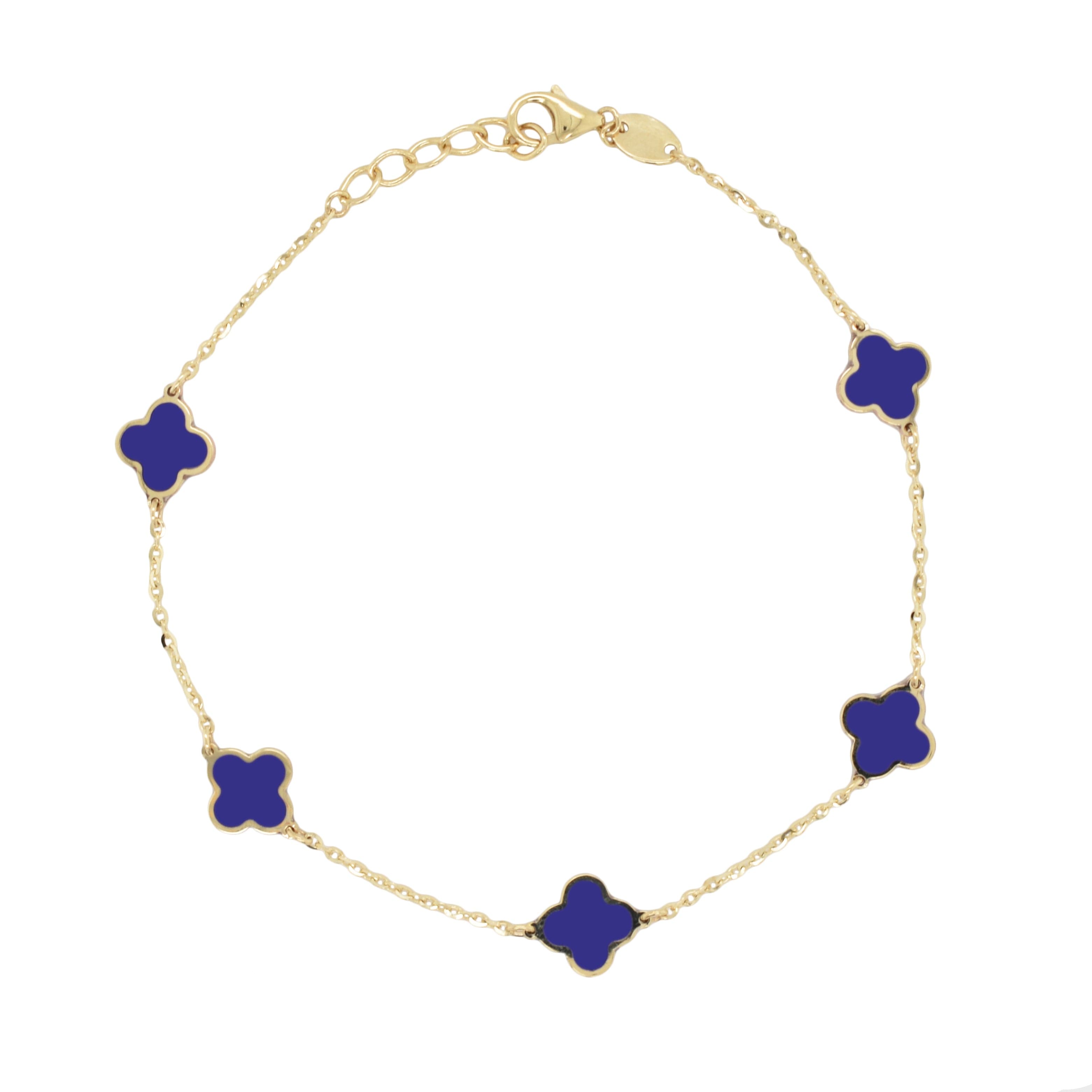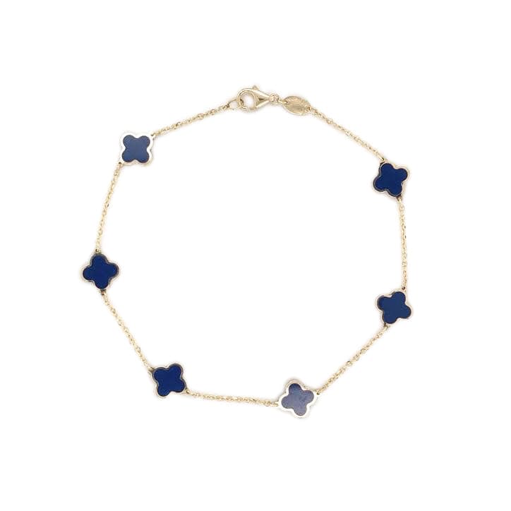 14K YELLOW GOLD LAPIS CLOVER STATION BRACELET