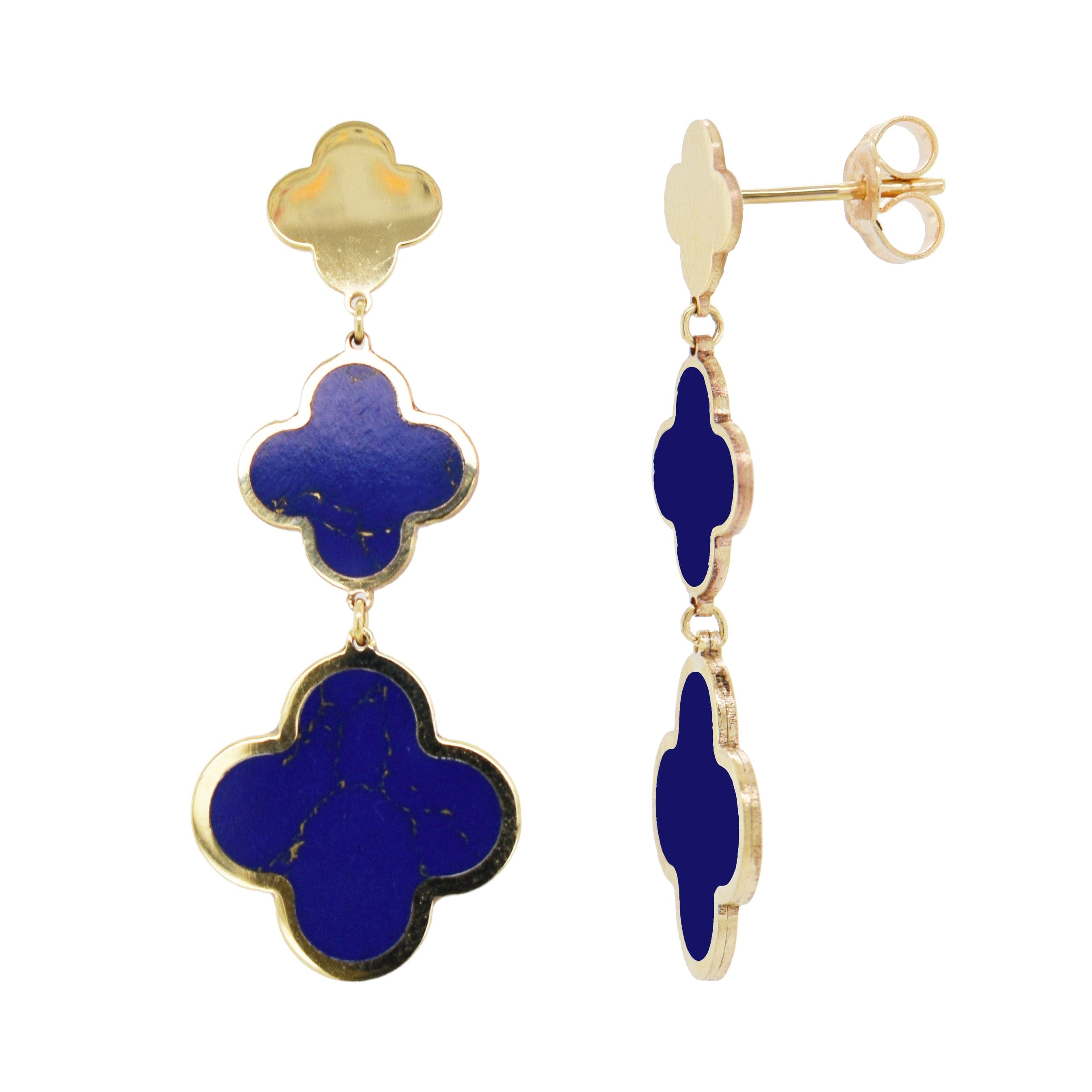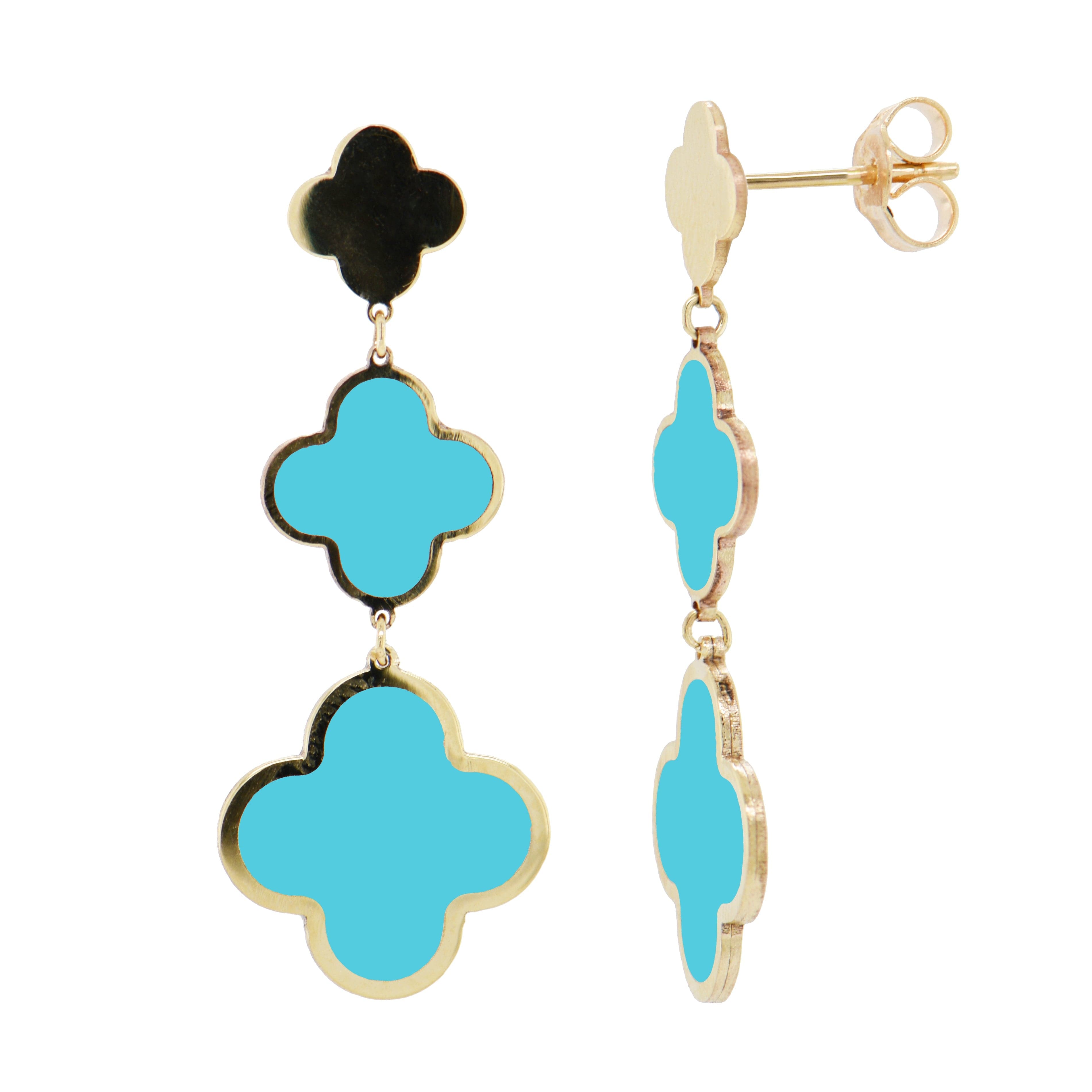 14K Gold Three Clover Gemstone Inlay Dangle Earrings