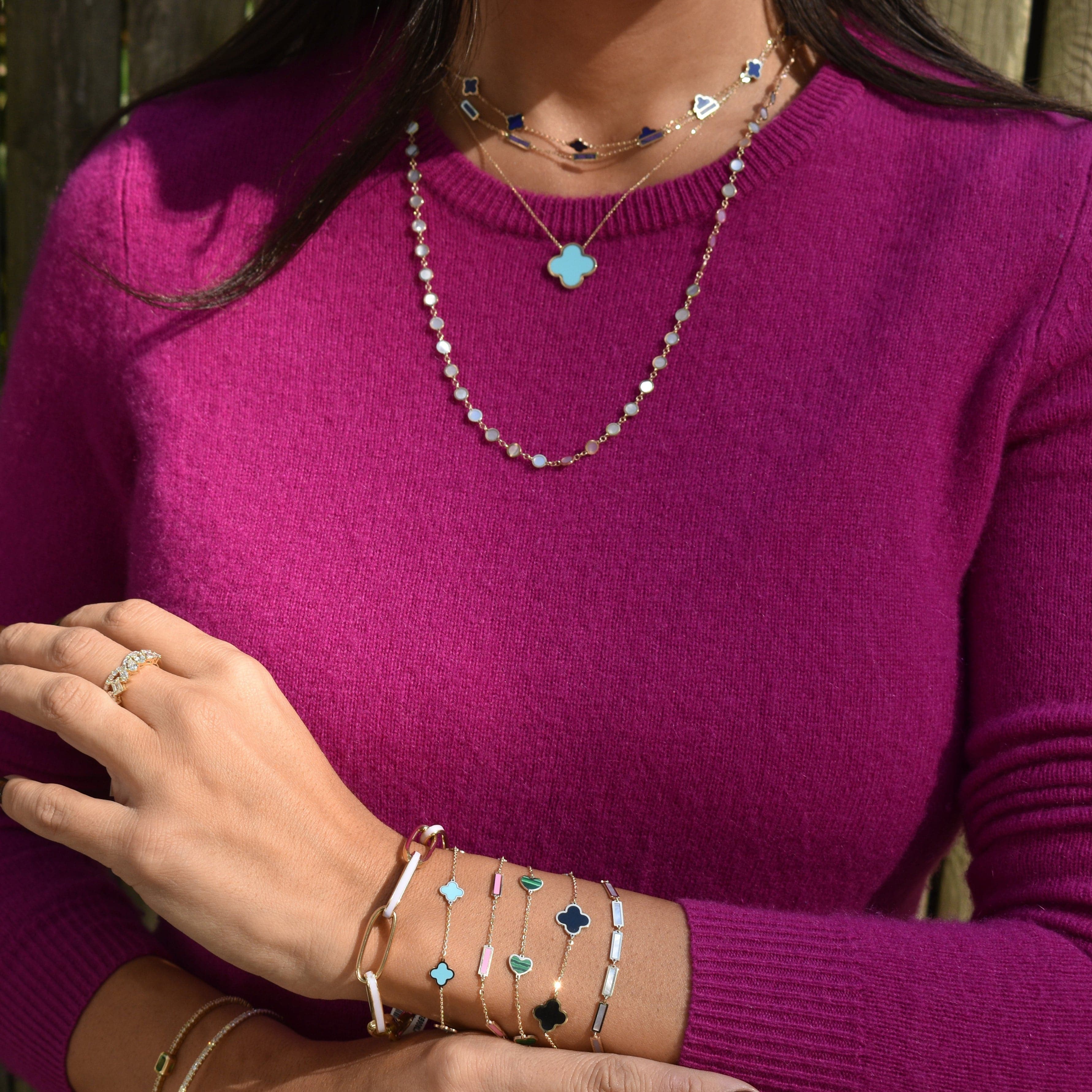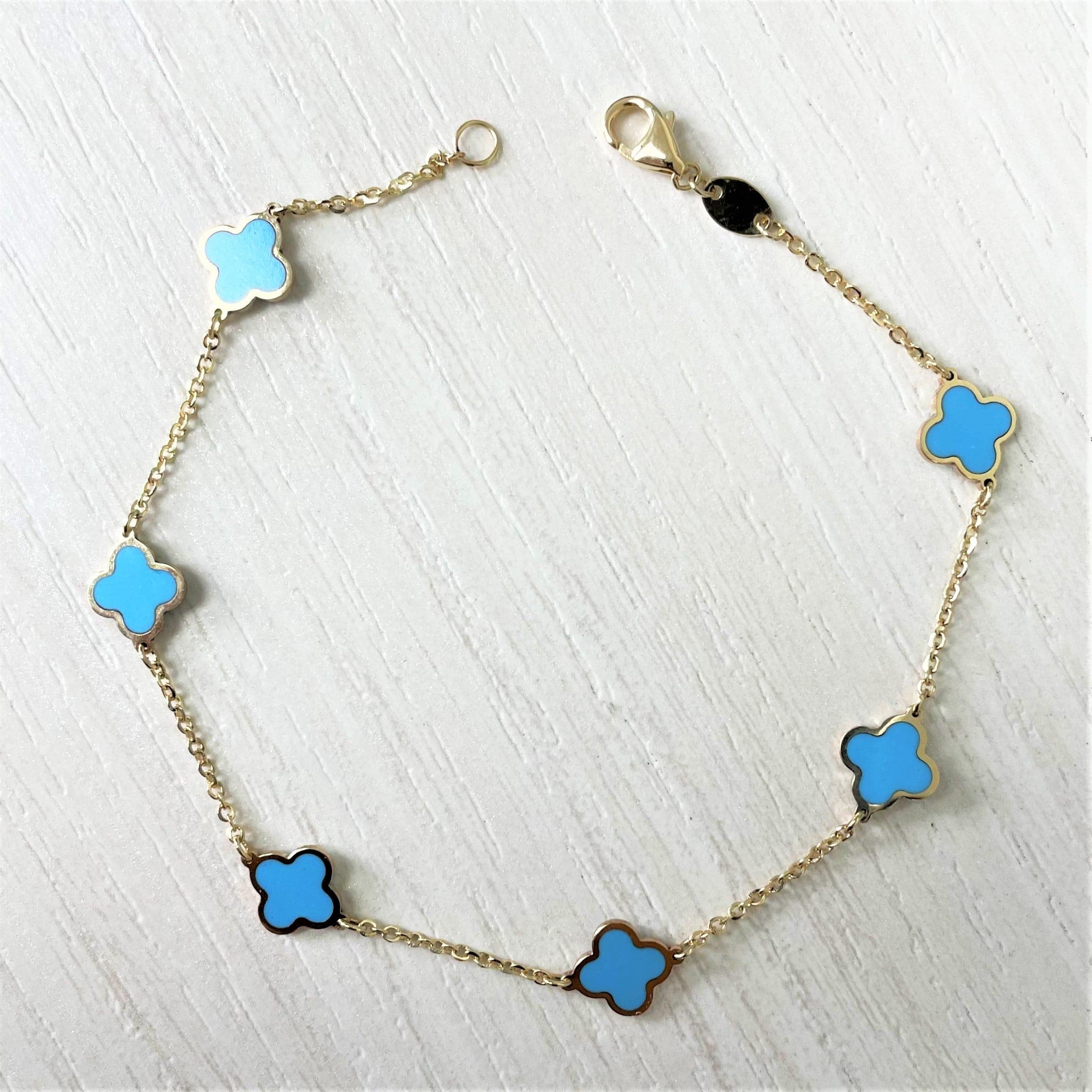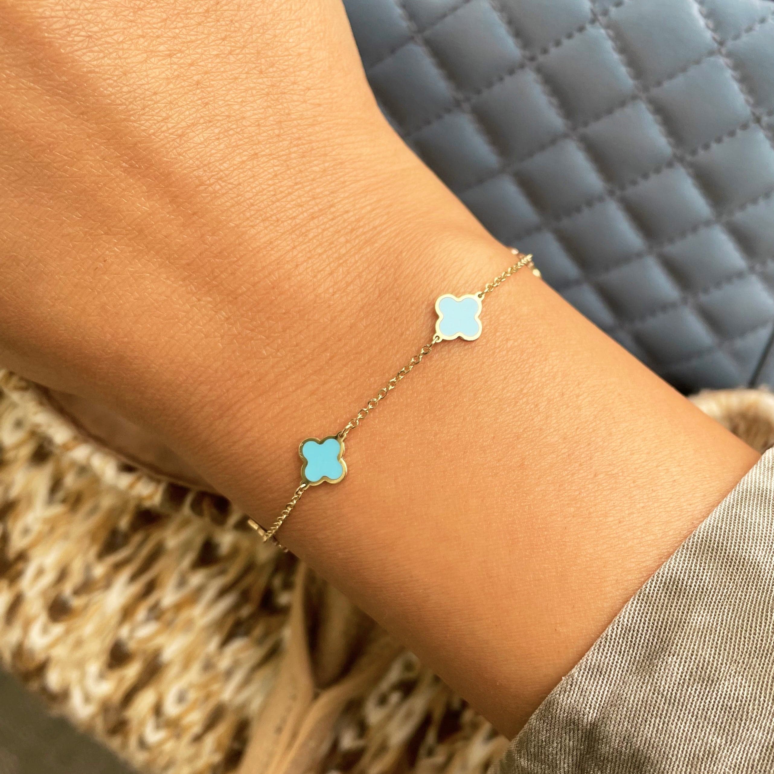 14K YELLOW GOLD TURQUOISE CLOVER STATION BRACELET