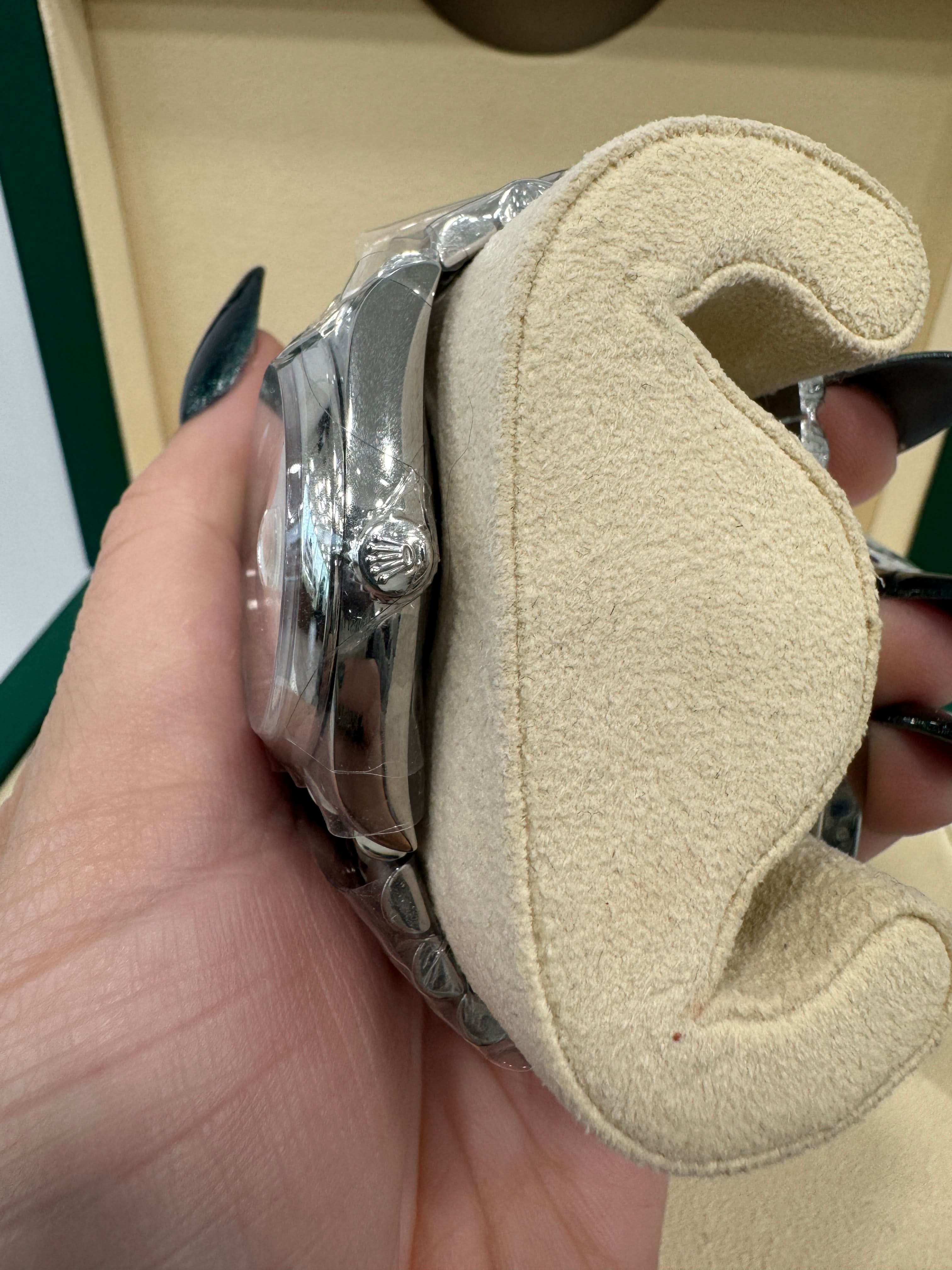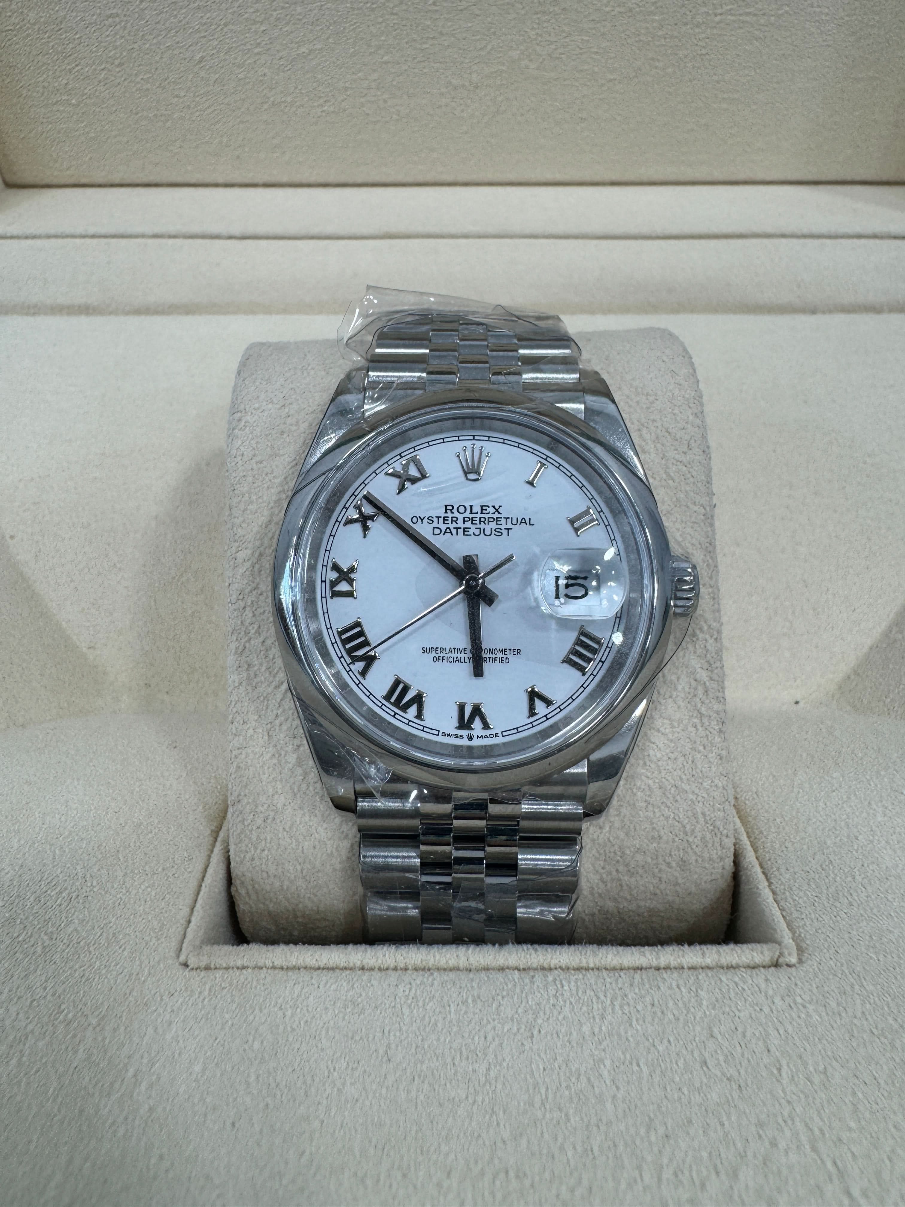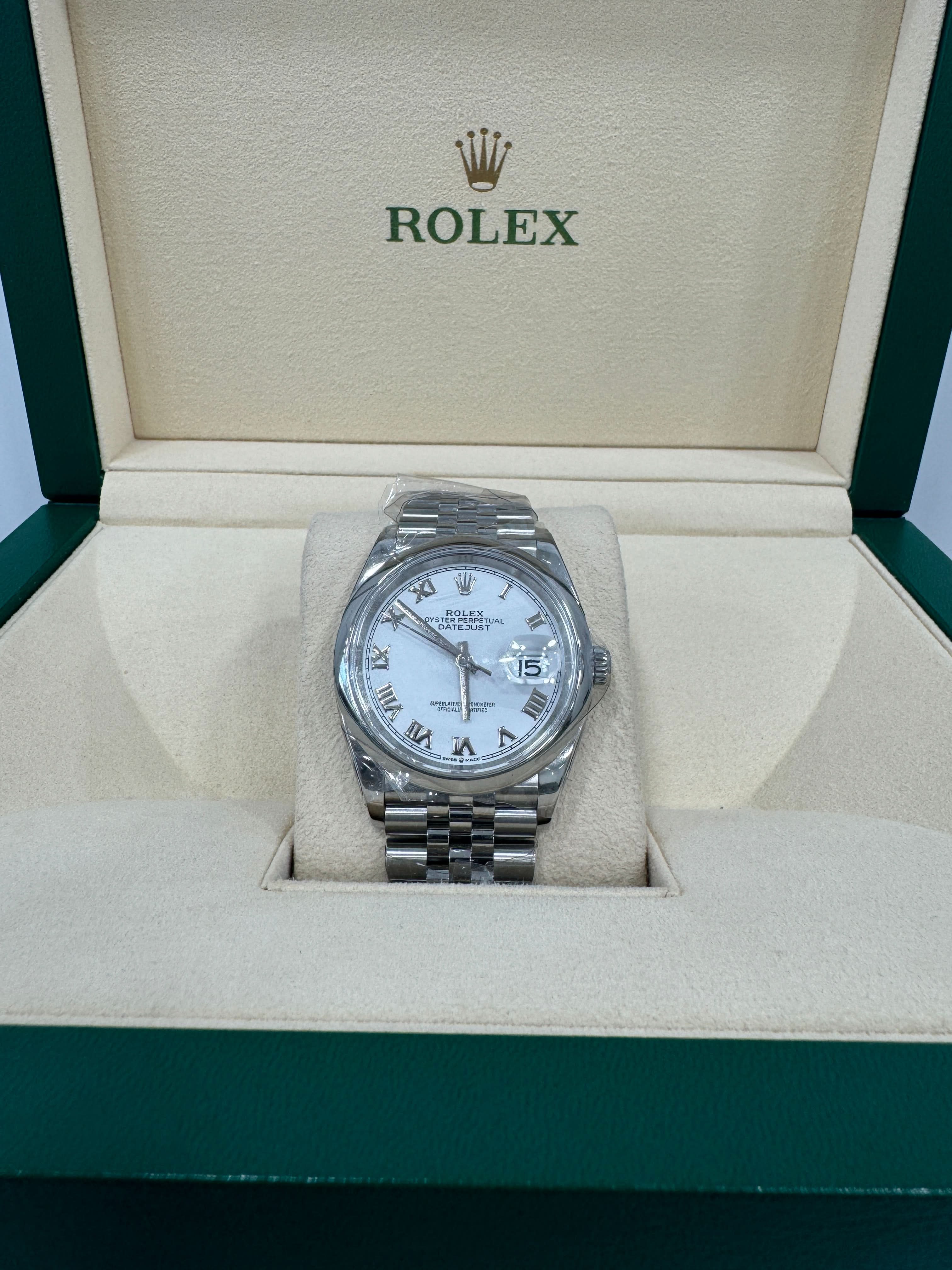 This classic pre-owned Rolex Datejust, from approximately 1995-1998, embodies timeless elegance and precision. Featuring a 36mm stainless steel case, this Datejust has a smooth bezel that complements its refined look. The clean white dial is adorned with bold Roman numeral hour markers, adding a touch of sophistication, while the date window at 3 o'clock includes the iconic Rolex Cyclops lens for easy readability. The watch is paired with a comfortable Jubilee bracelet, known for its intricate links and distinctive style. This piece is sold without the original box or papers, making it a perfect option for a collector or enthusiast looking for a genuine, high-quality Rolex at an accessible price.