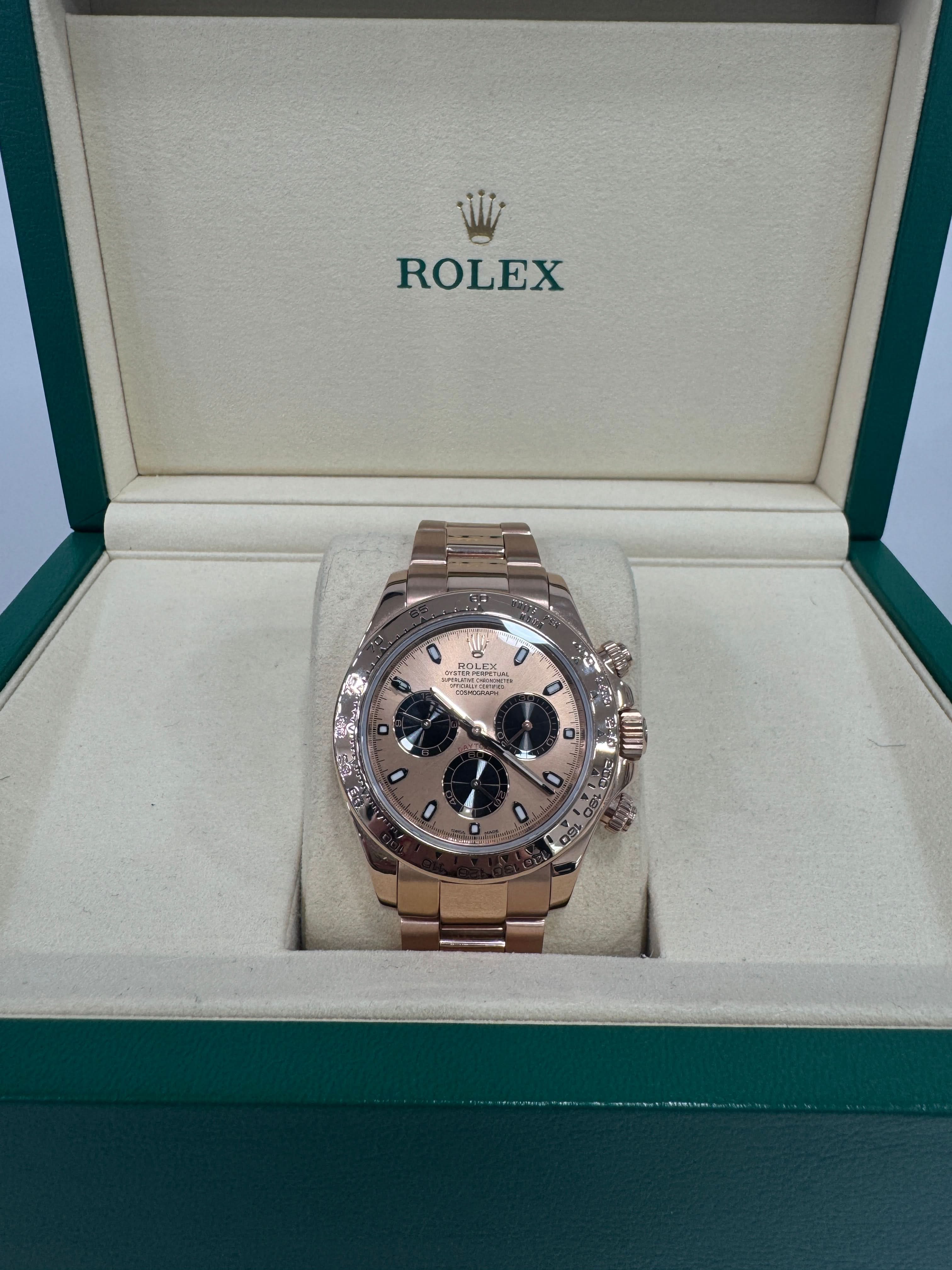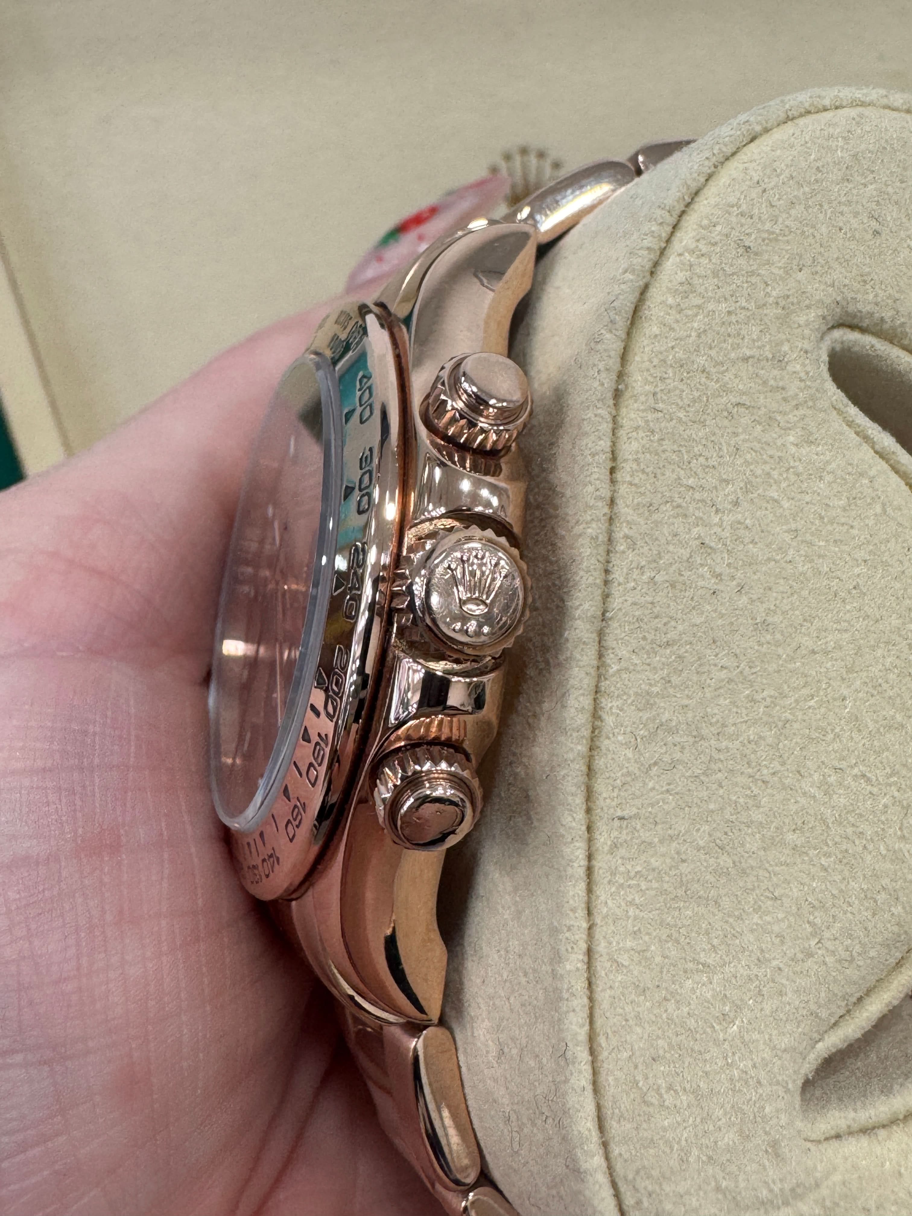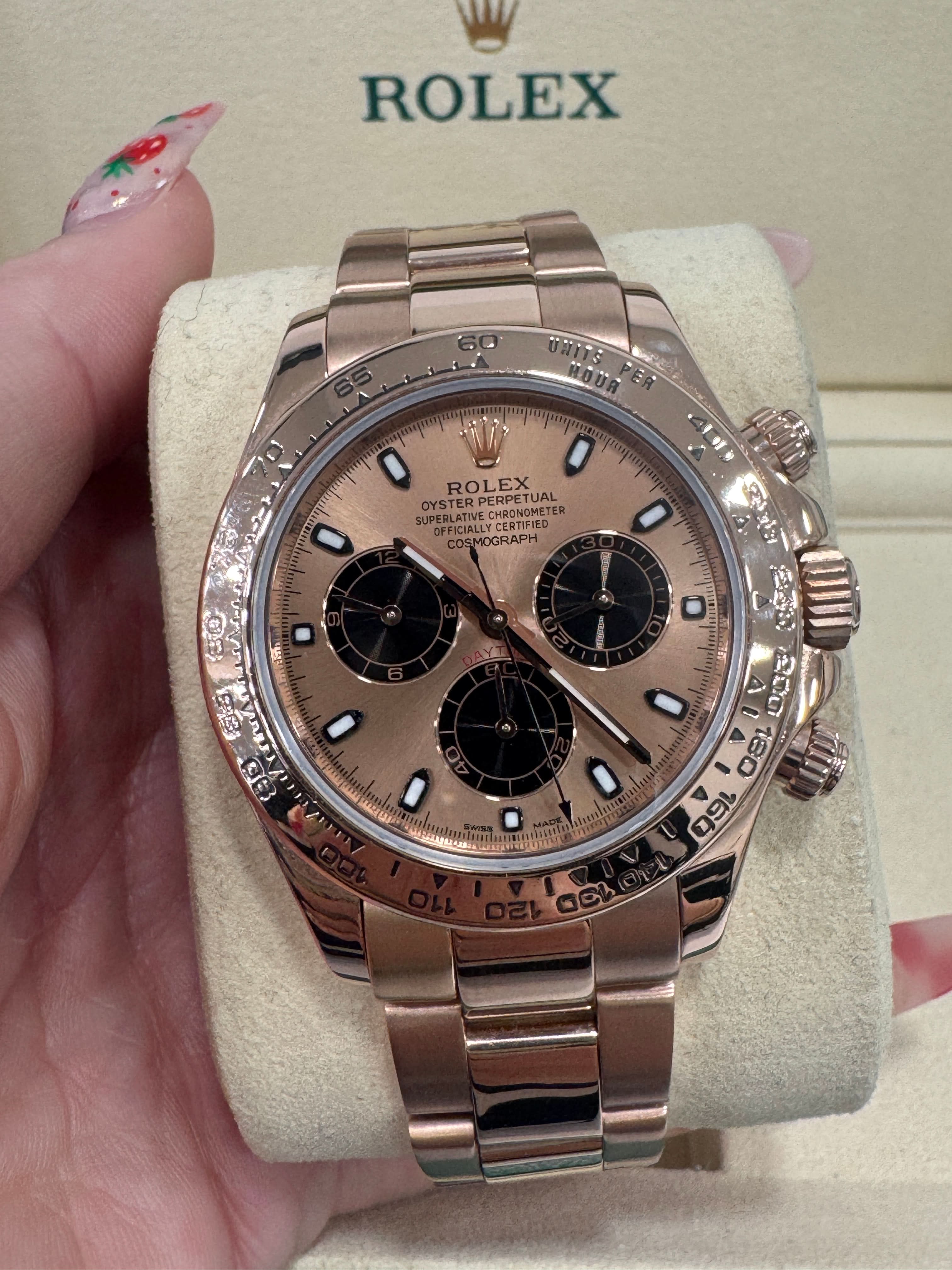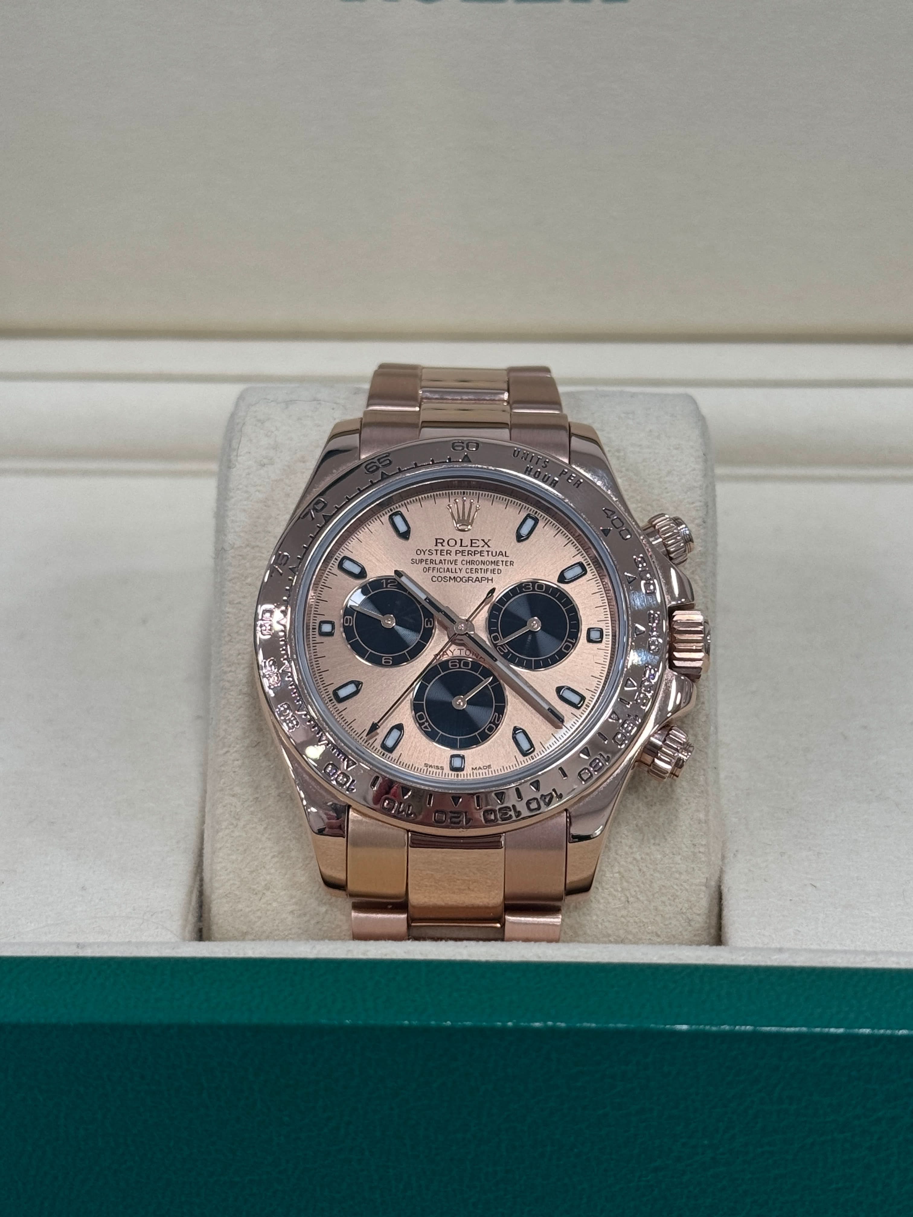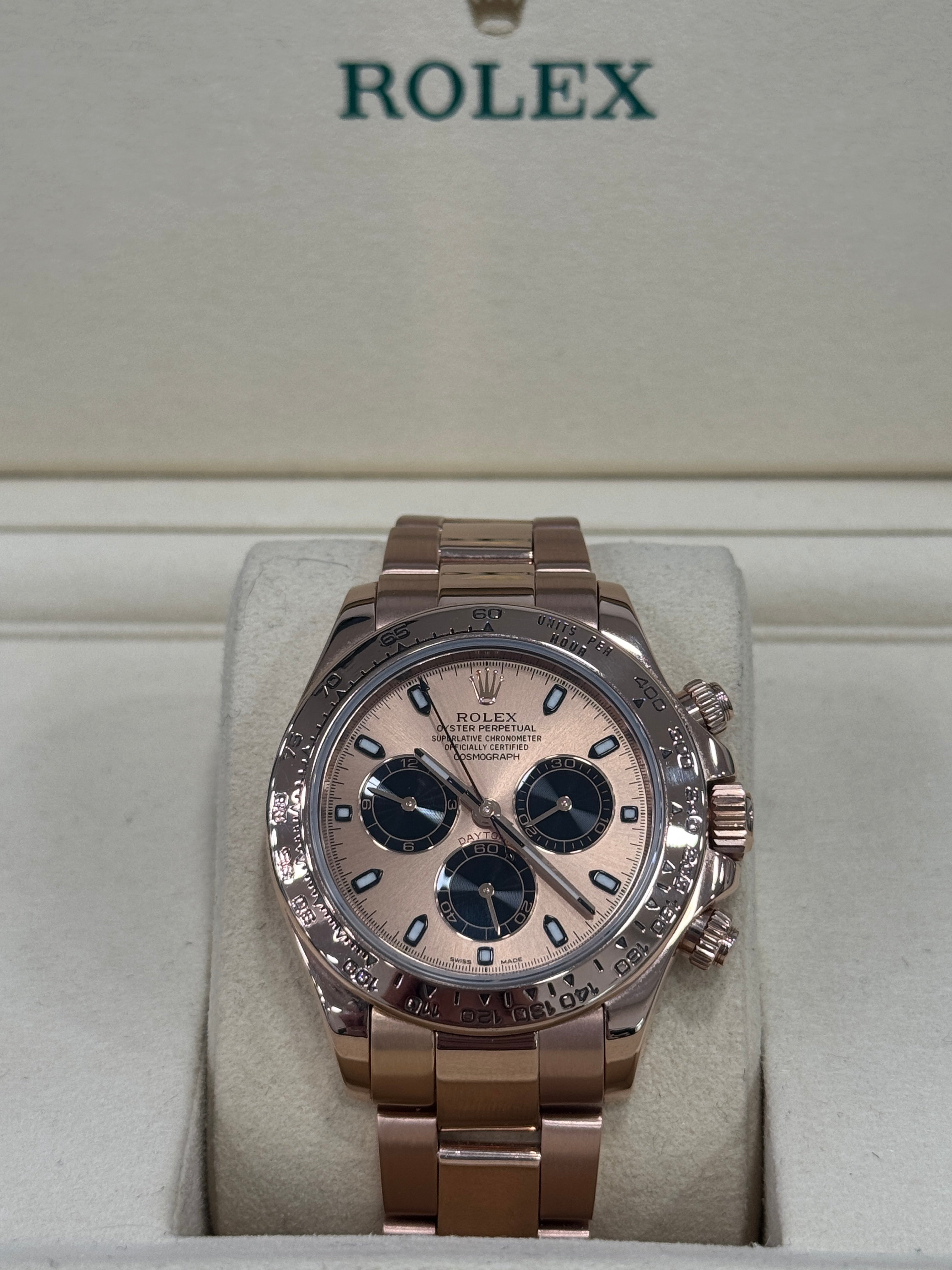 Though this watch does not come with its original box and papers, it has been carefully inspected for authenticity and remains in excellent condition, showing only minor signs of wear consistent with its age. The case and bracelet maintain their original luster, and the signature tachymeter bezel is crisp and well-preserved. Whether you're an avid Rolex collector or seeking a statement piece with timeless appeal, this rose gold Daytona stands out as a refined and highly desirable investment.