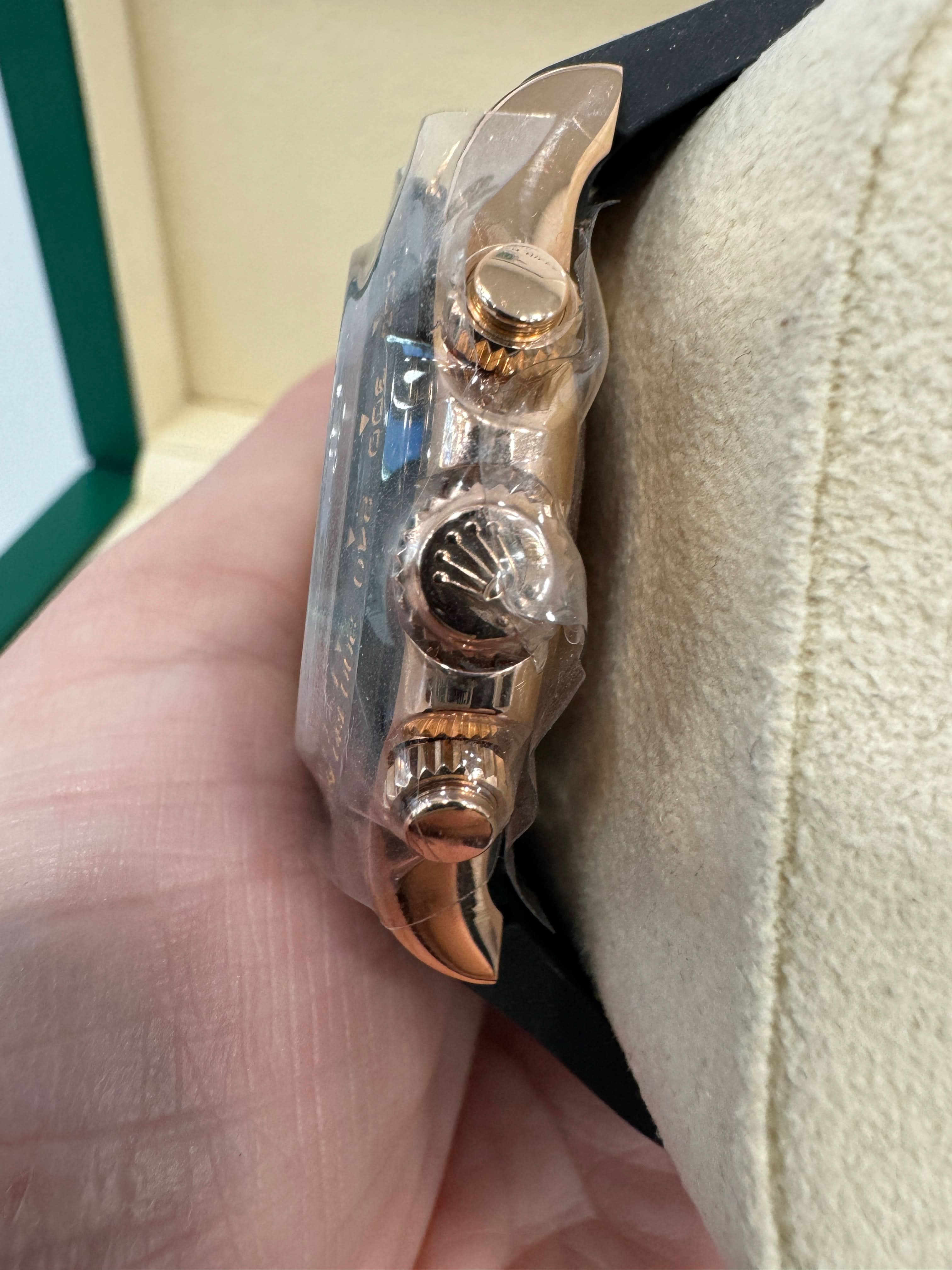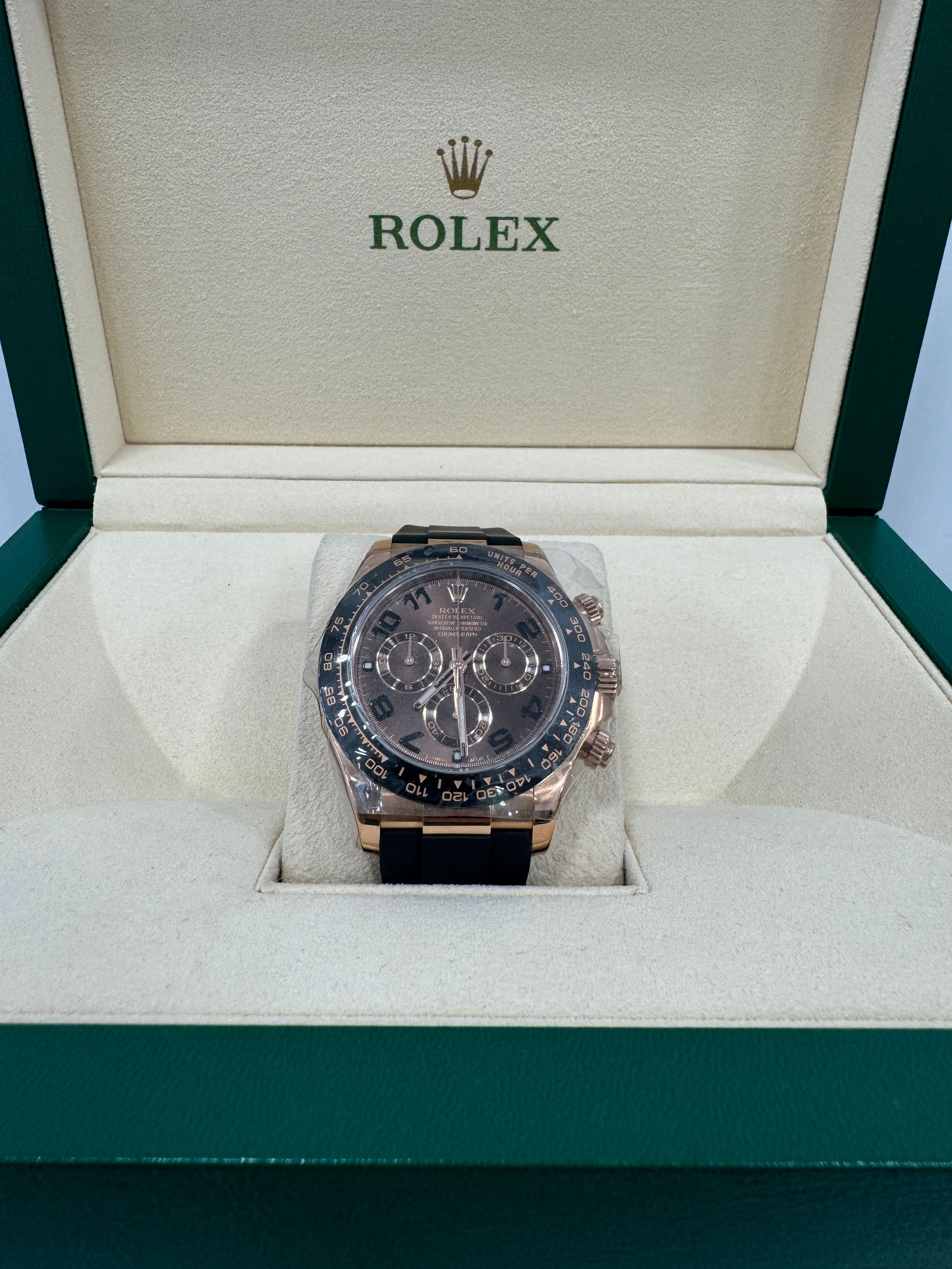 This 2013 Rolex Daytona comes complete with its original box and papers, adding value and authenticity to this coveted timepiece. The combination of the exquisite rose gold case, striking black dial, and innovative Oysterflex bracelet makes this Daytona not only a statement of sophistication but also a versatile companion, suitable for both casual and formal occasions. A true symbol of Rolex's commitment to craftsmanship and precision, this watch is perfect for collectors and enthusiasts alike.