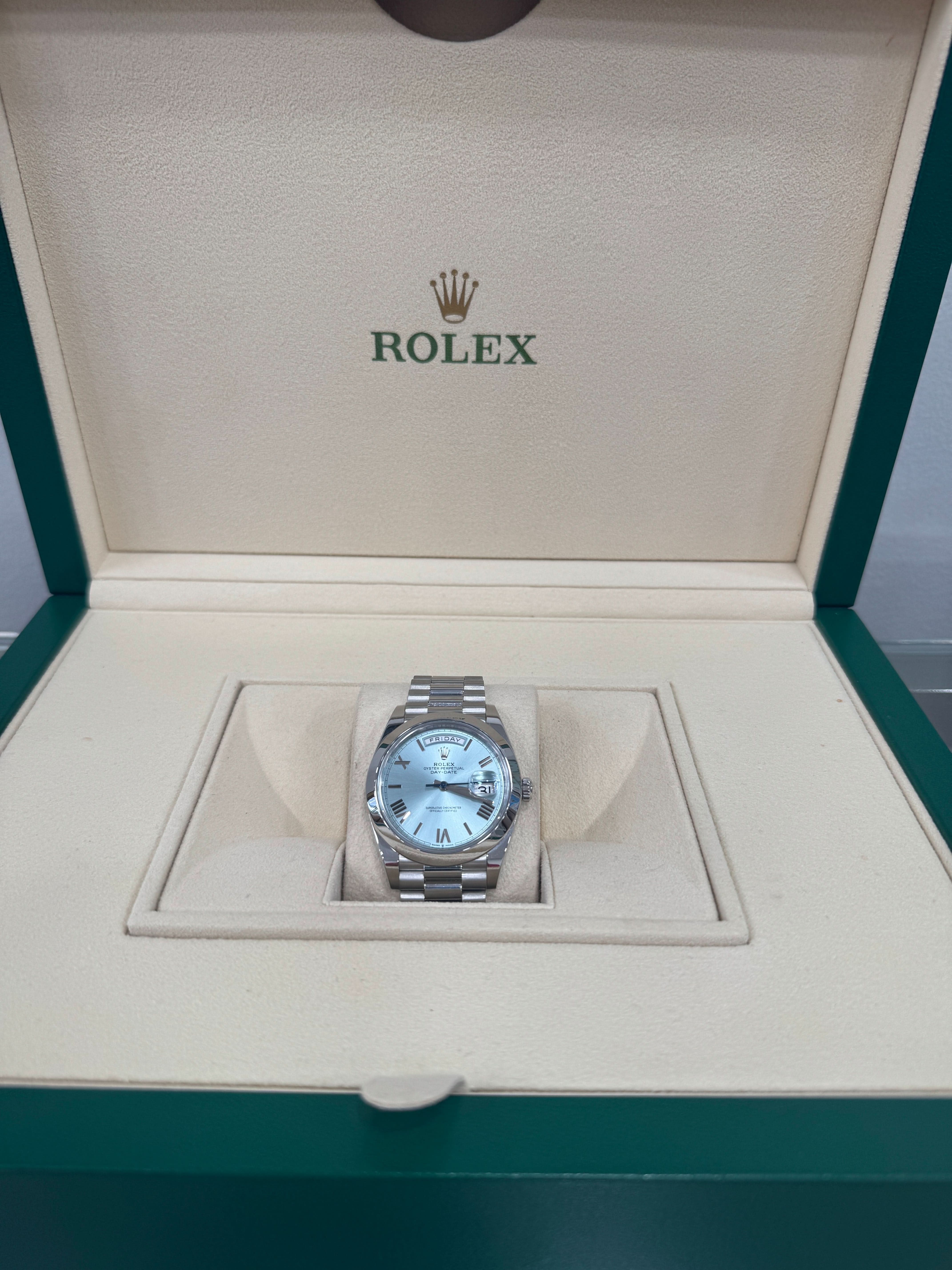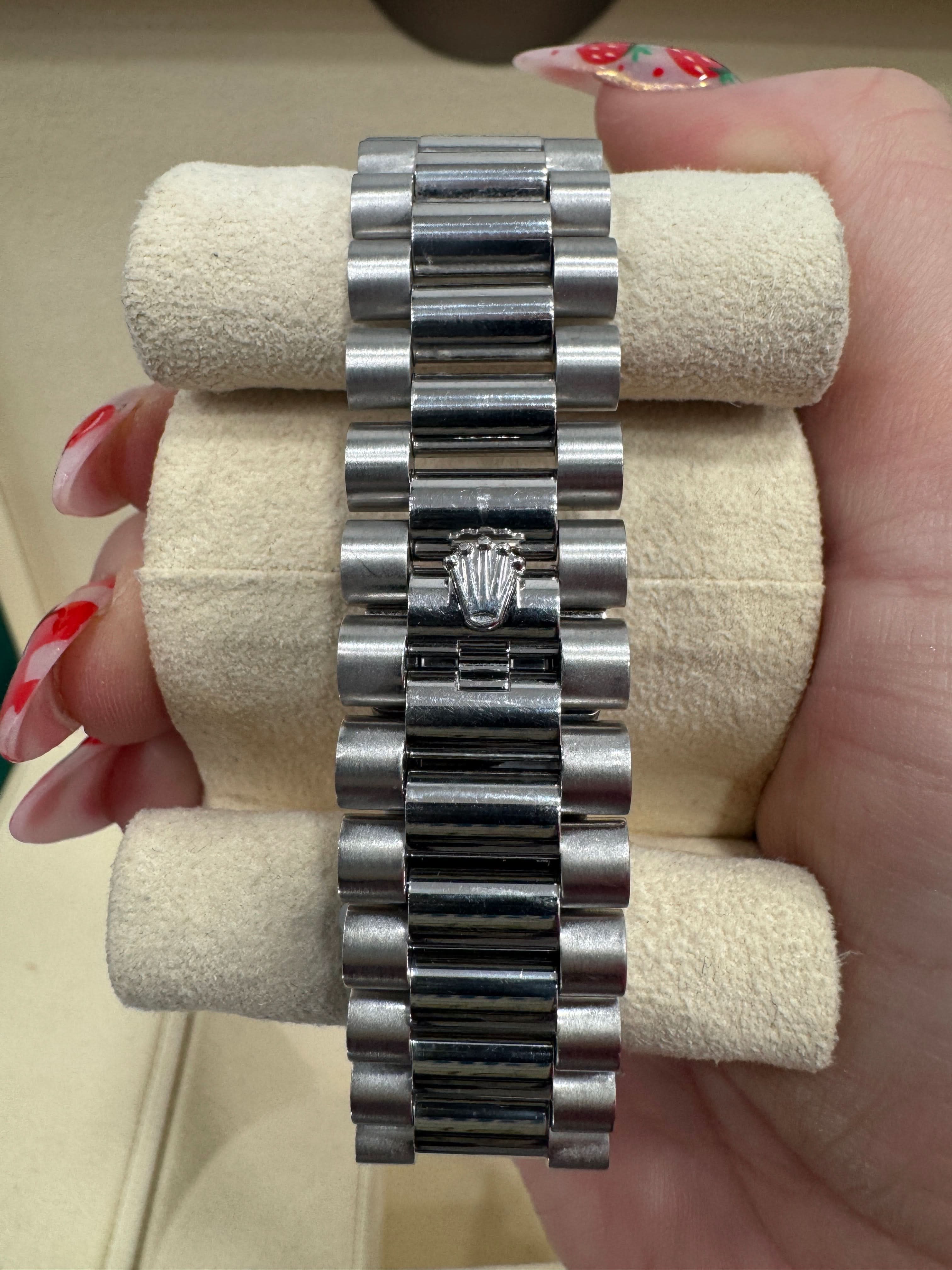 This exquisite piece comes complete with its original box and papers, preserving its authenticity and value. A perfect investment for serious collectors and watch enthusiasts, this platinum Day-Date 40mm is more than just a timepiece—it’s a statement of excellence, craftsmanship, and success.