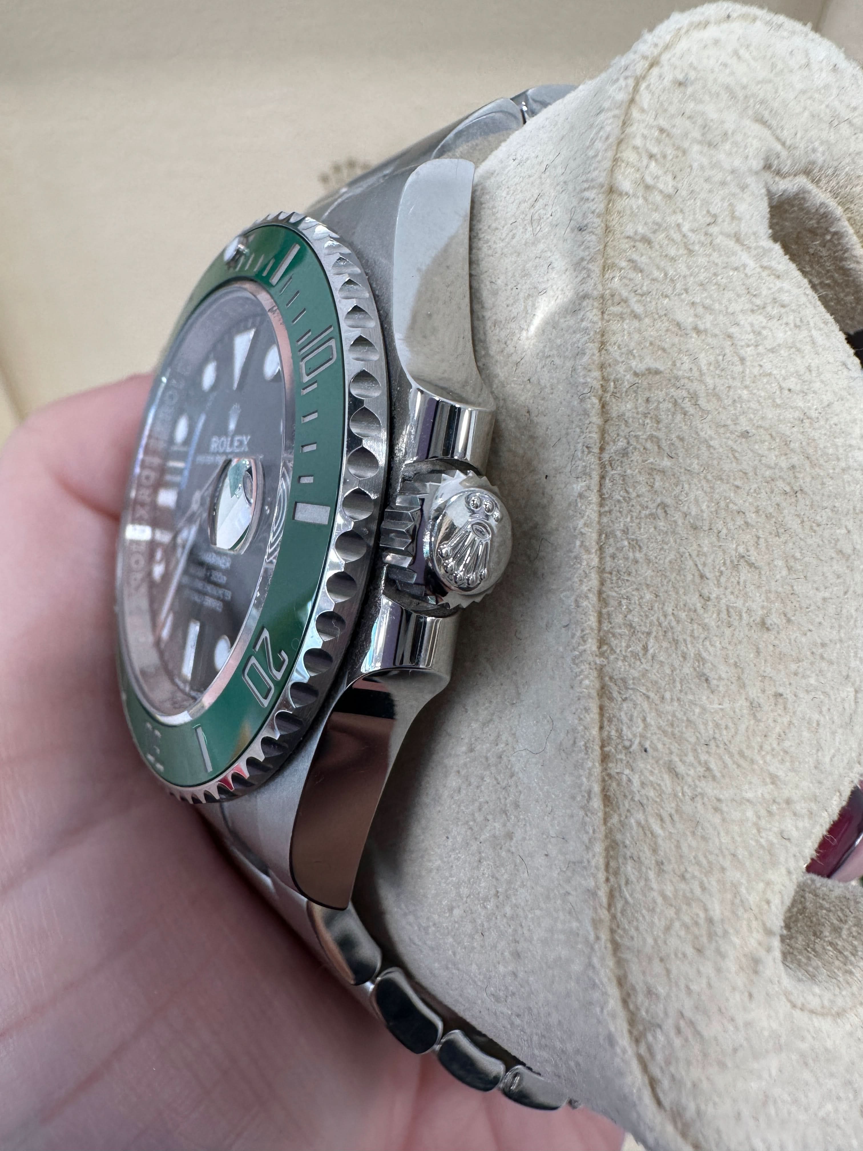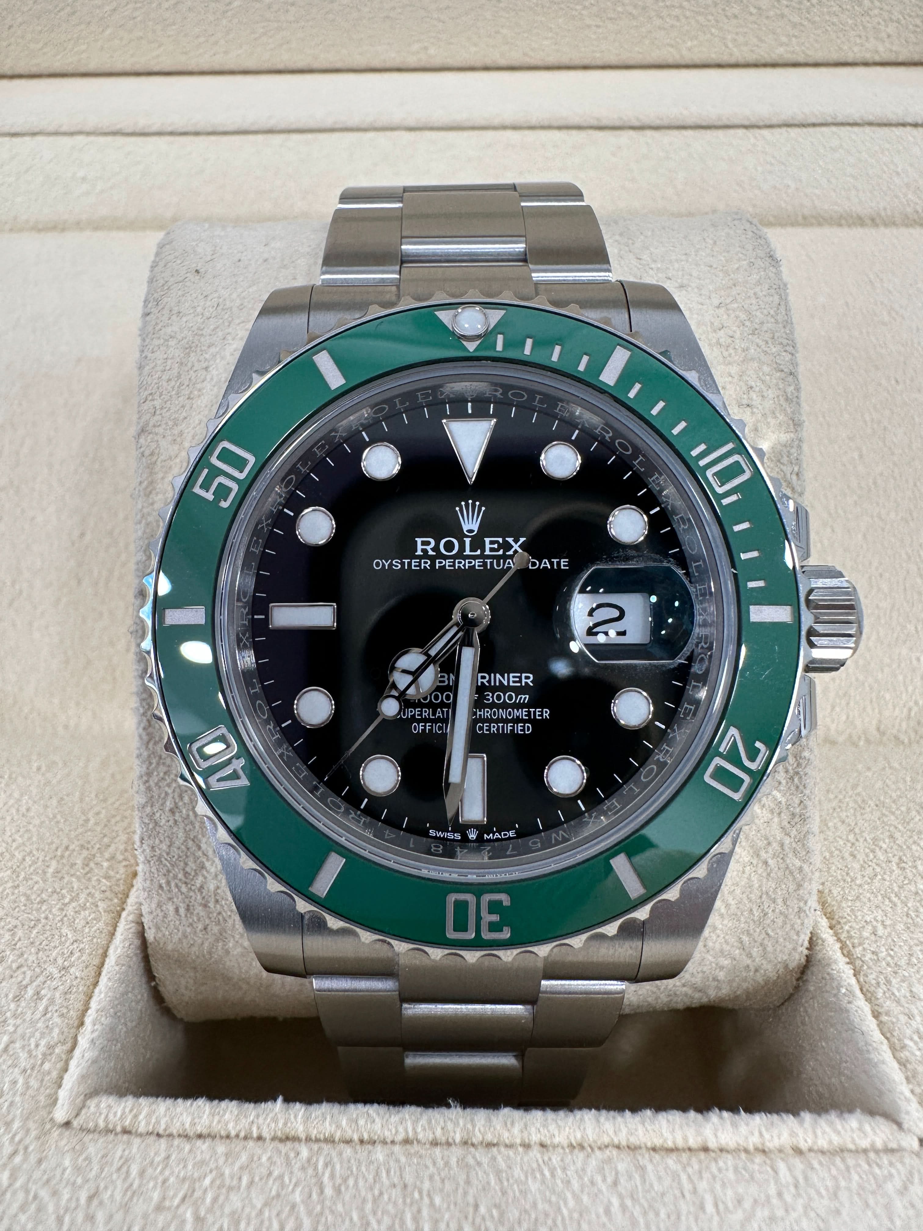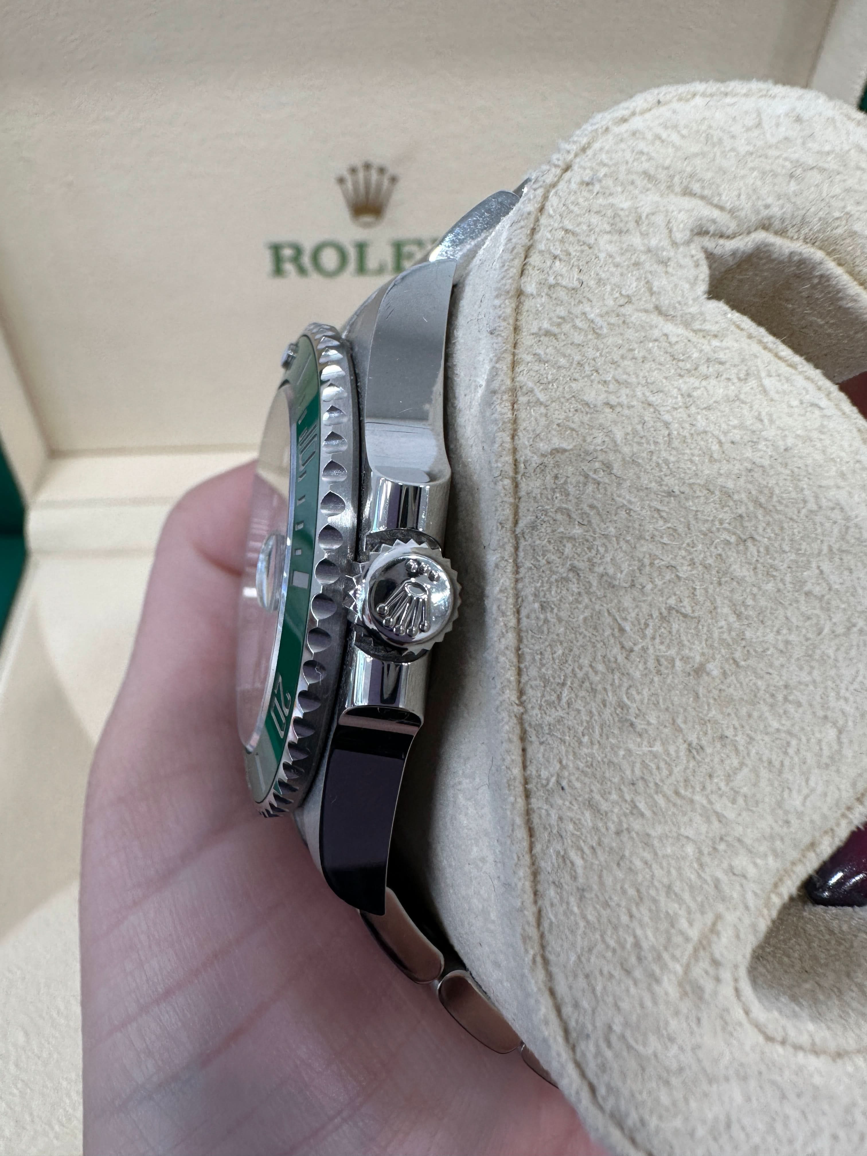 This Submariner is water-resistant up to 300 meters (1,000 feet), embodying the durability and performance that Rolex’s diving watches are celebrated for. It comes with the original box and official Rolex papers, adding value and authenticity to this remarkable timepiece. Whether you’re adding to a collection or looking for a robust yet stylish everyday luxury watch, this 2023 green Rolex Submariner is sure to make a statement.