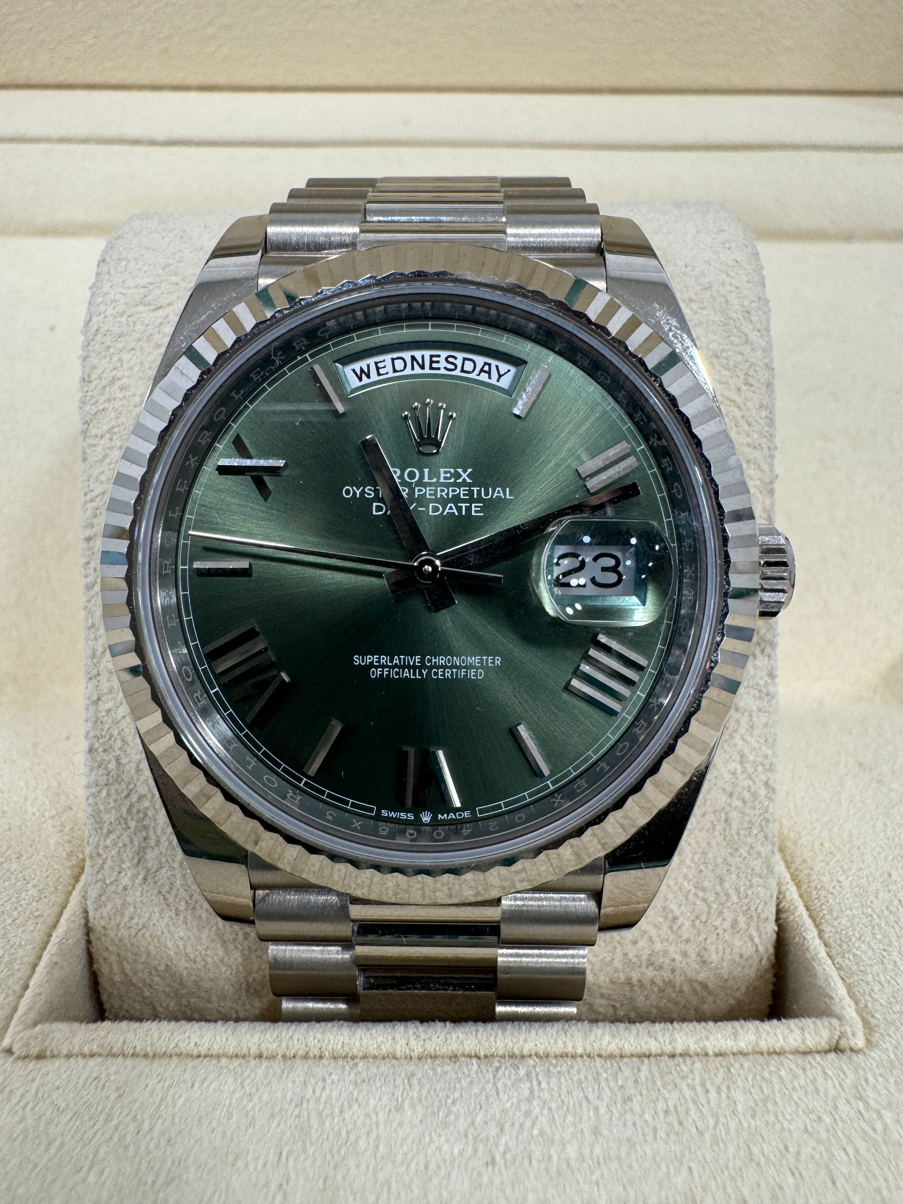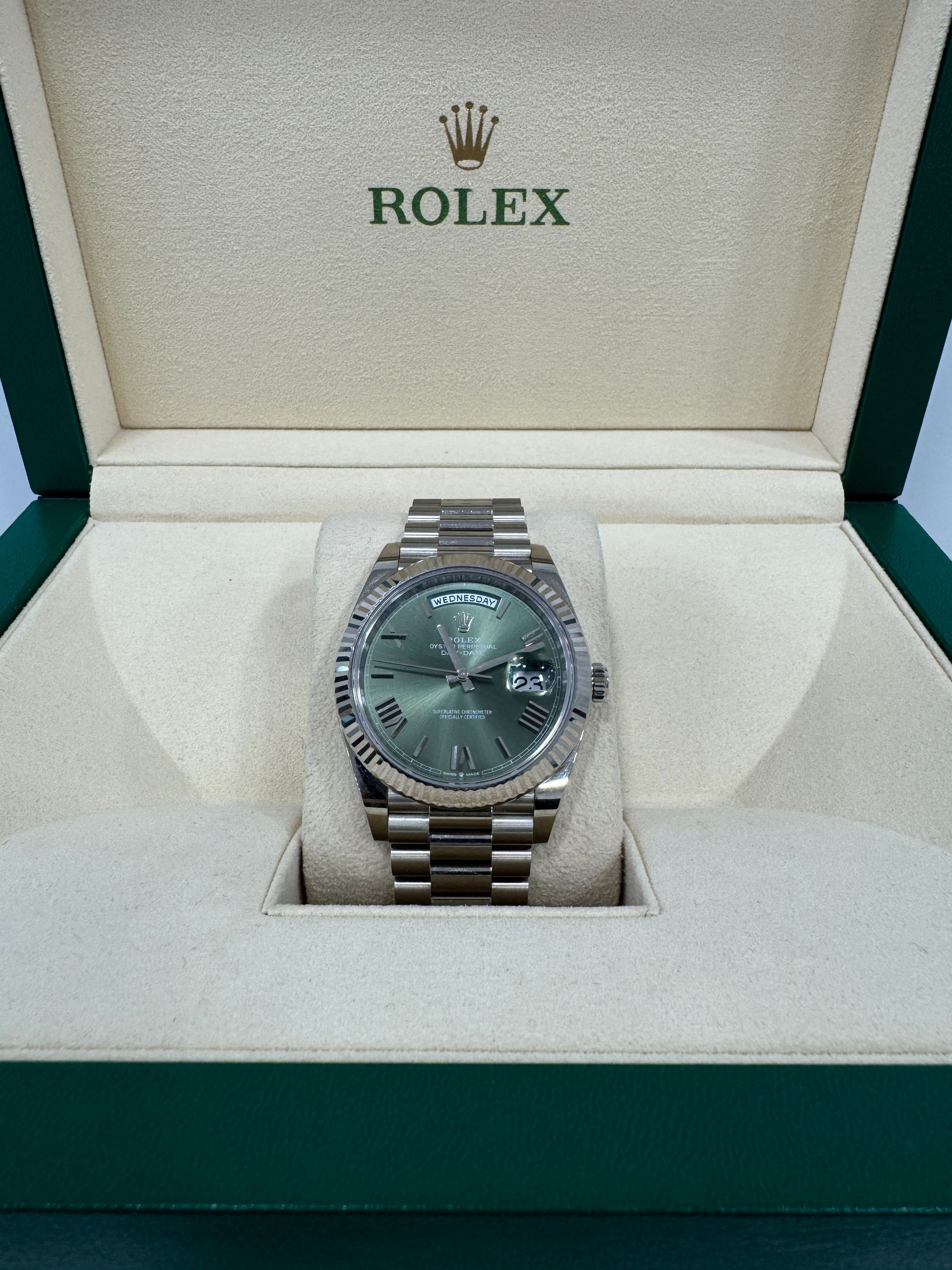 This 2023 pre-owned white gold Rolex Day-Date with an olive green face is a stunning blend of luxury and sophistication. Crafted from 18k white gold, the 40mm case features a smooth bezel that enhances its refined appearance, making it suitable for both formal and casual occasions. The standout olive green dial provides a striking contrast against the white gold, adorned with luminous hour markers and hands for visibility in various lighting conditions.