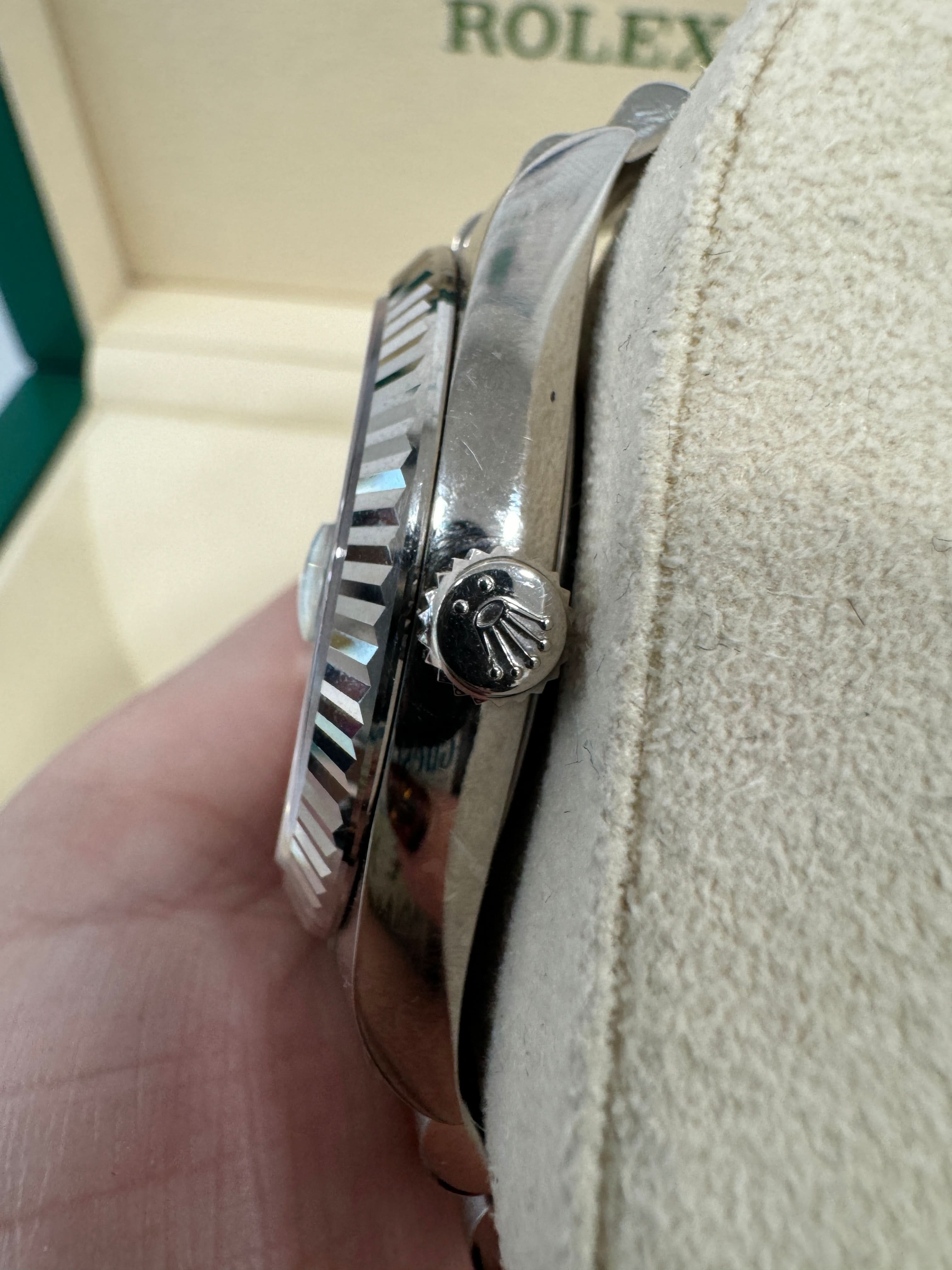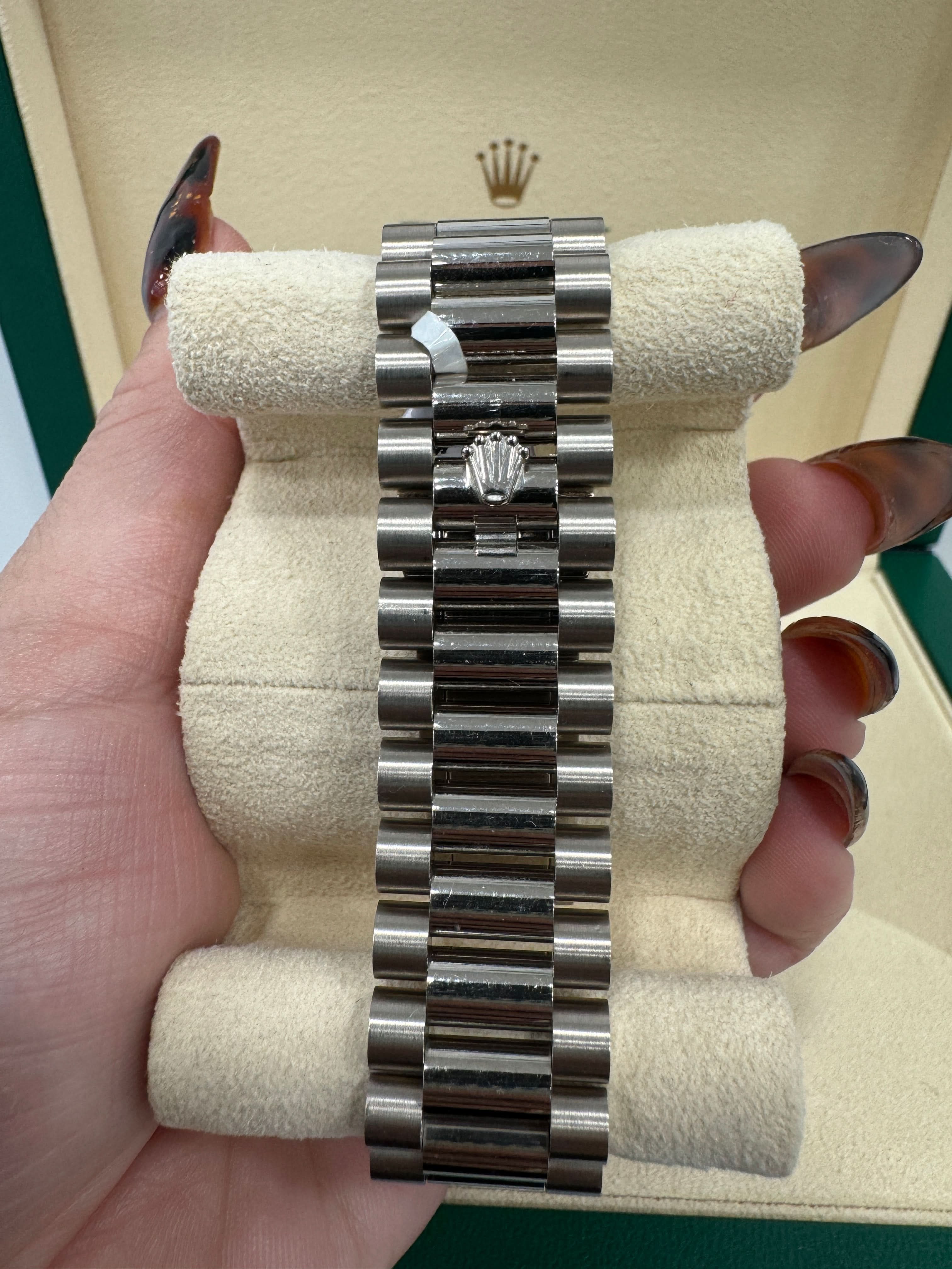 Powered by Rolex's in-house Caliber 3255 automatic movement, the Day-Date ensures precision and reliability, boasting a power reserve of approximately 70 hours. With its luxurious materials, unique color palette, and iconic design, the 2023 white gold Rolex Day-Date is not just a timepiece but a statement of elegance and prestige, making it an exceptional addition to any watch collection.