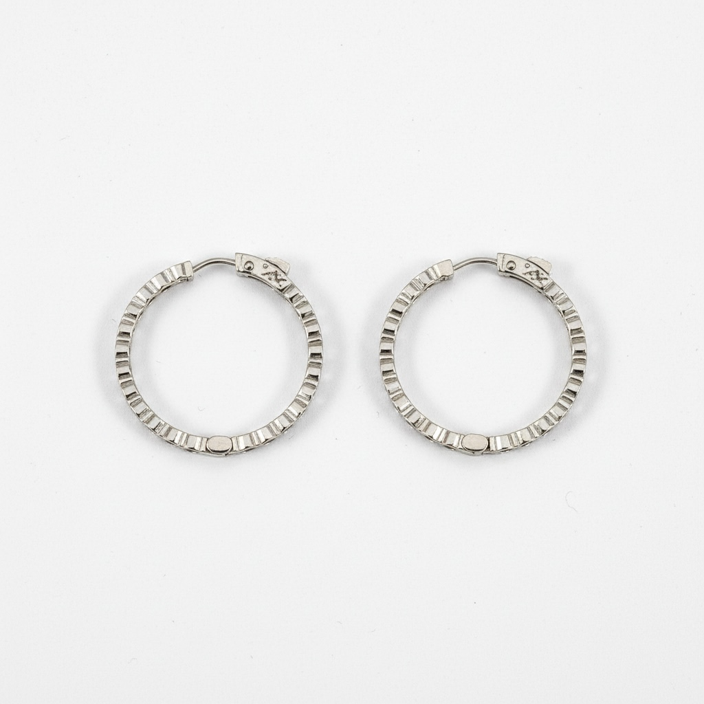 Elevate your jewelry collection with these sophisticated diamond hoops, featuring 44 round brilliant diamonds totaling 4.40 carats of natural brilliance. Meticulously set in 14k white gold, these earrings showcase exceptional sparkle and timeless elegance. The secure latch back closure ensures your investment remains safely in place throughout the day. A versatile essential that transitions seamlessly from professional settings to evening occasions, these hoops deliver the refined luxury that discerning collectors appreciate.