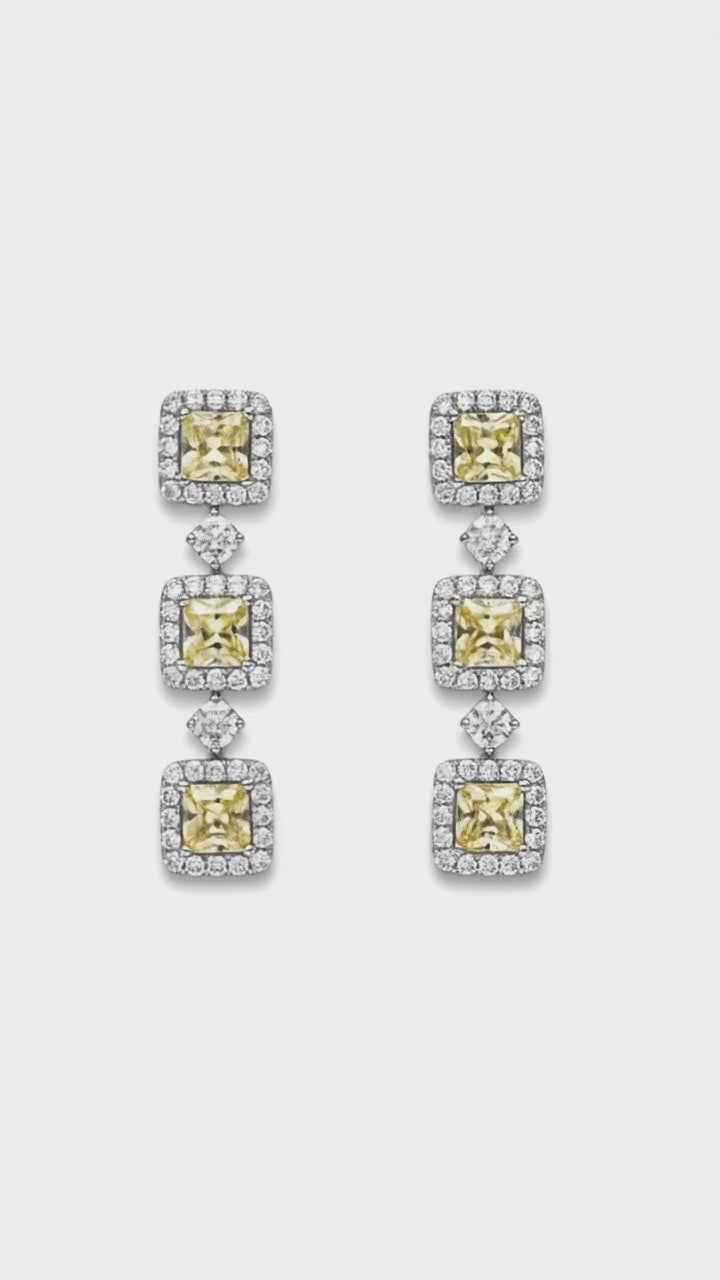 Our Nashville TN Jewelry Shop presents: Radiant yellow diamonds take center stage in these sophisticated drop earrings, showcasing six natural princess cut stones totaling 3.12 carats. Complemented by 100 round brilliant diamonds weighing 2.34 carats, the design achieves a harmonious balance of color and sparkle. Expertly set in 14k white gold, these earrings deliver 5.46 total carats of refined elegance. The princess cut's geometric precision enhances the warm glow of the yellow diamonds, while the surrounding brilliants amplify light and dimension. An investment piece that transitions seamlessly from day to evening wear.