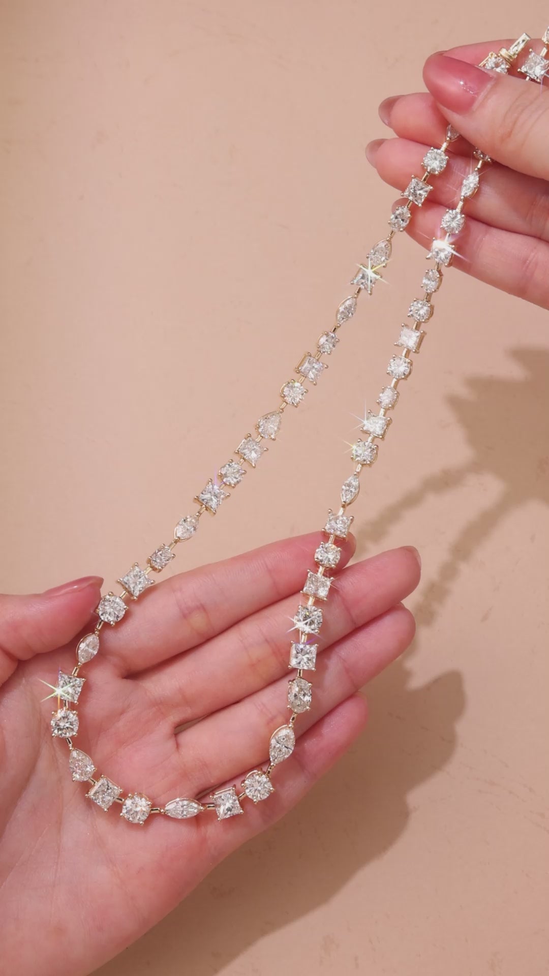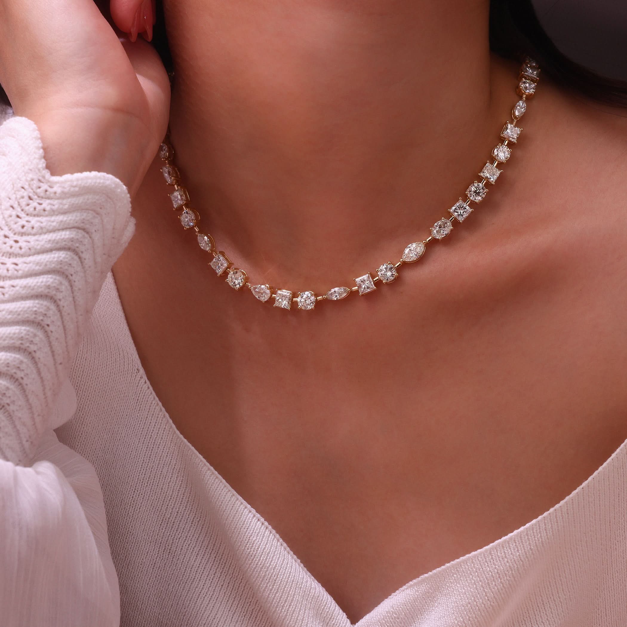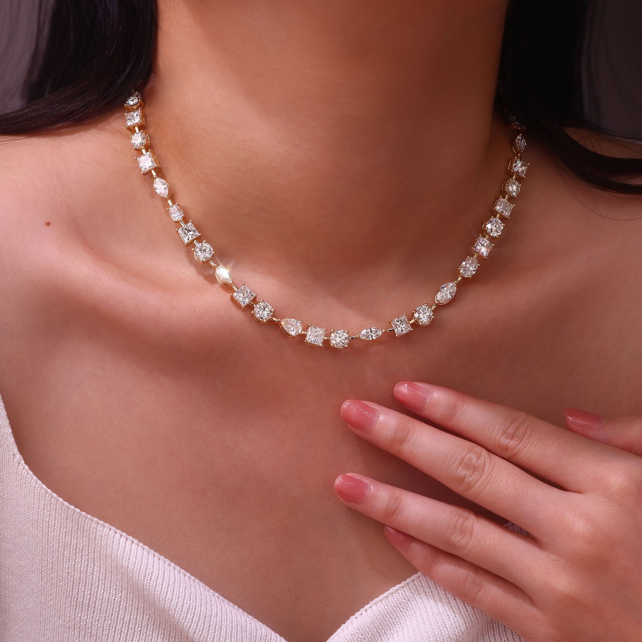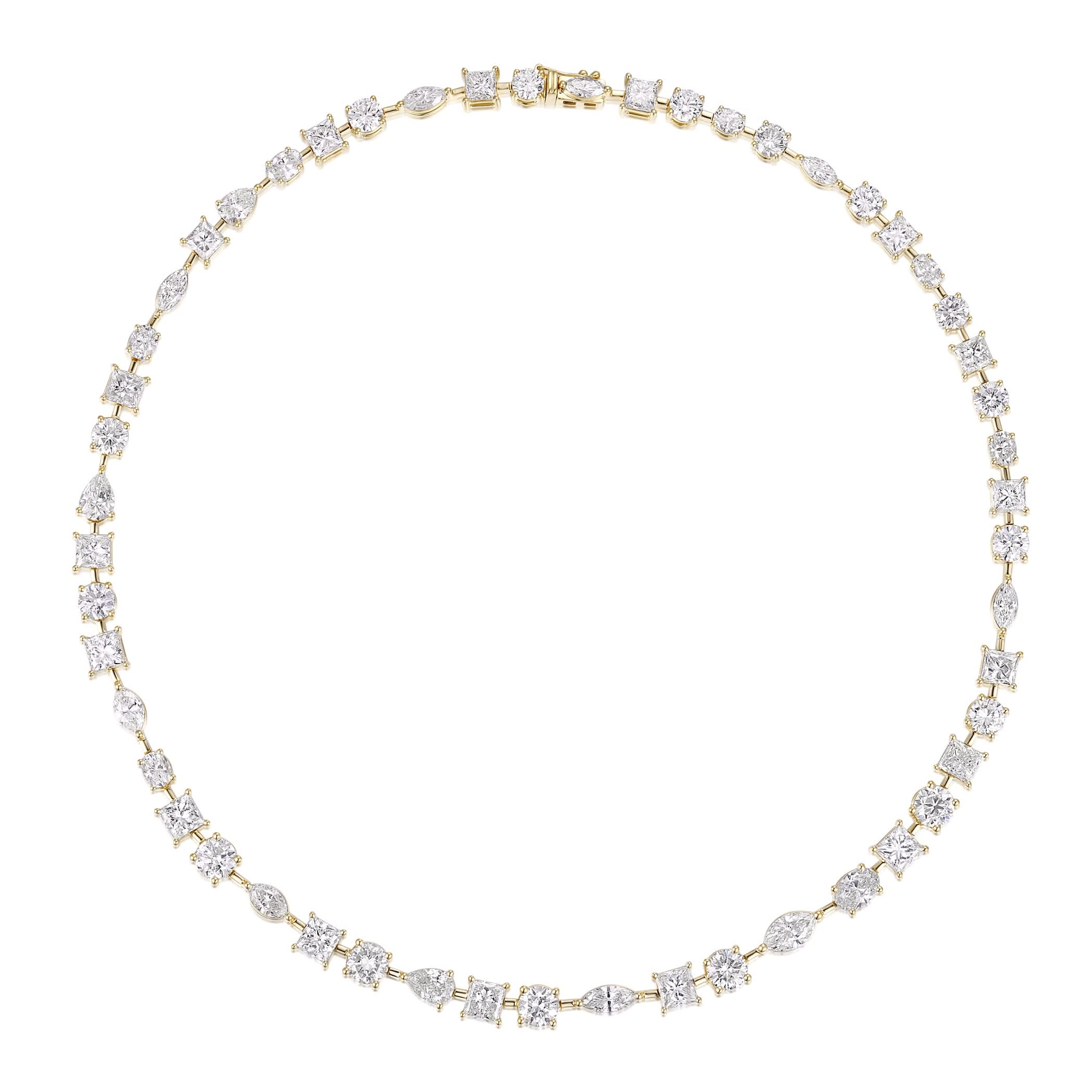 This breathtaking tennis necklace features a dazzling array of marquise, round, pear, and princess-cut diamonds, totaling an impressive 37.95 carats. Crafted in luxurious 18k yellow gold, the alternating diamond shapes create a stunning interplay of brilliance and texture, adding a dynamic and sophisticated touch. Each diamond is expertly set to ensure maximum sparkle, while the warm gold setting enhances the beauty and elegance of the design. Perfect for special occasions, this necklace is a statement piece that exudes timeless glamour and opulence.