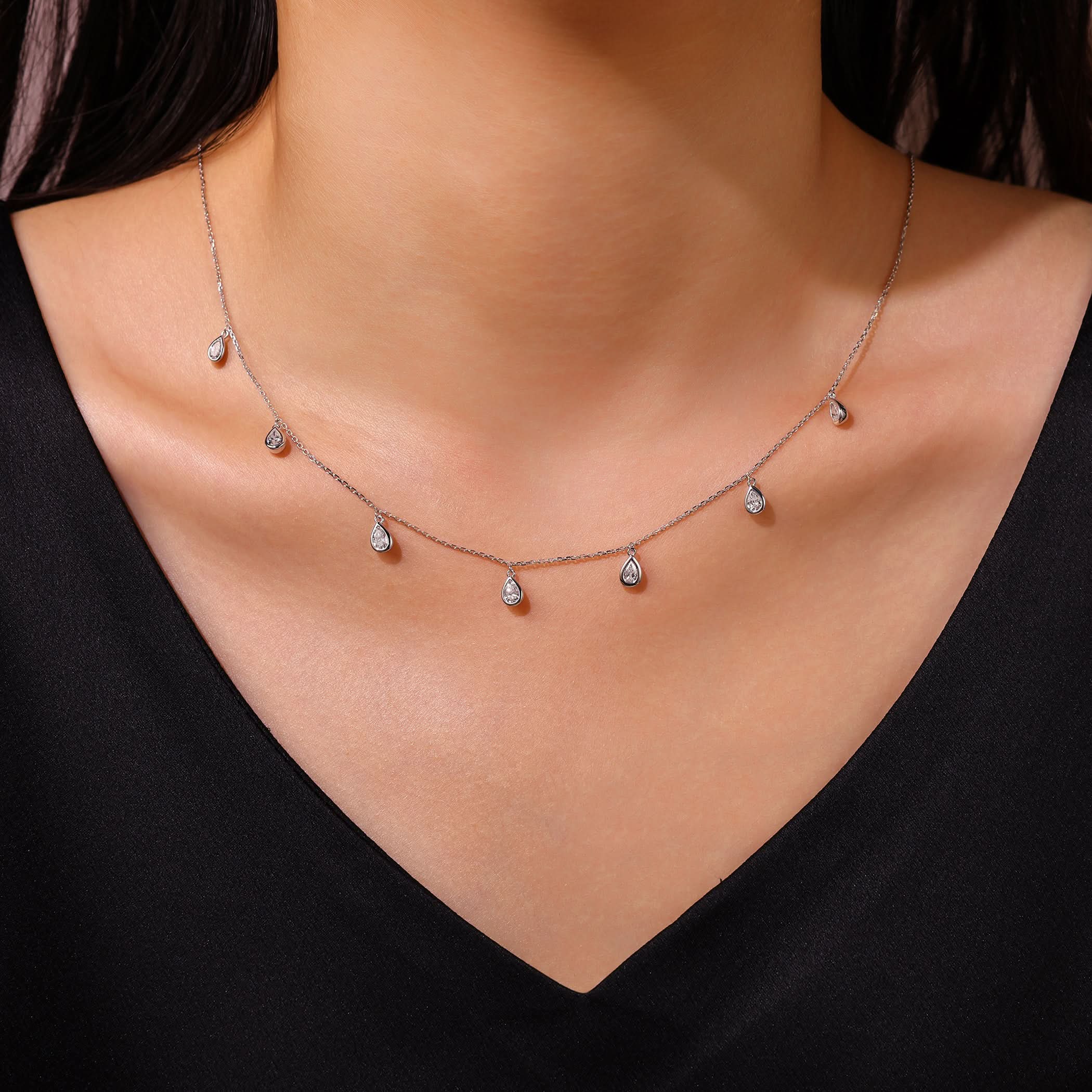 This elegant necklace features seven pear-shaped diamond droplet pendants, totaling 1.22 carats, gracefully set in 14k white gold. Each diamond is bezel-set for a sleek and contemporary look, enhancing its brilliance while providing durability. The delicate white gold chain perfectly complements the sparkling diamonds, creating a harmonious and refined design. With its evenly spaced pendants, this necklace adds a touch of sophistication and movement, making it a versatile piece for both everyday wear and special occasions.