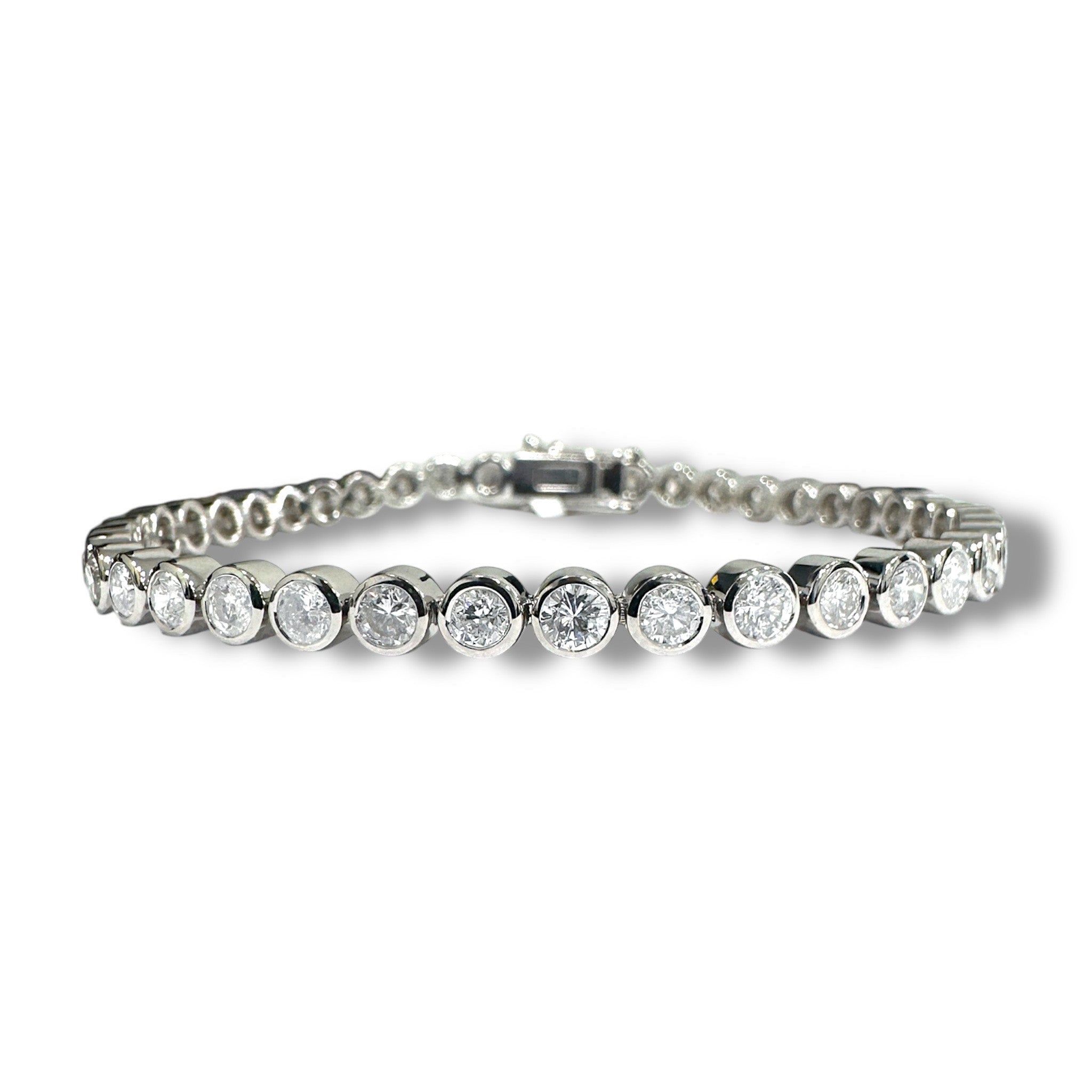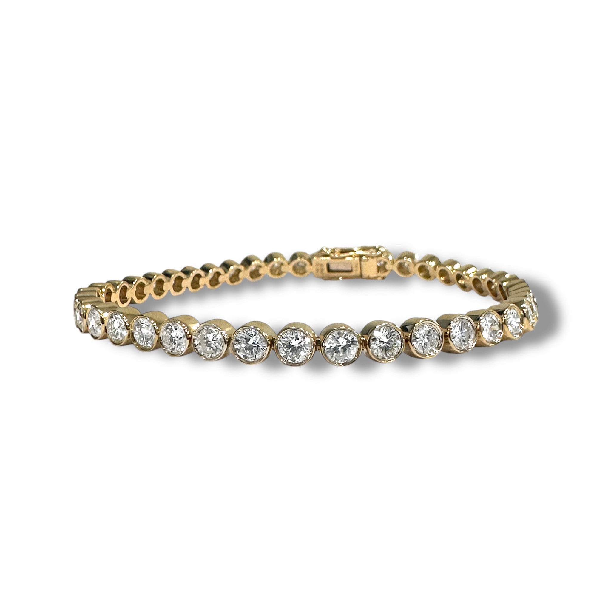 Sleek and sophisticated, these 14k gold tennis bracelets feature a full 5 carats of round brilliant diamonds, each securely bezel-set for a smooth, modern finish. Available in your choice of yellow or white gold, the clean design highlights each stone's brilliance while offering timeless versatility. A refined staple for both everyday luxury and elevated occasions.