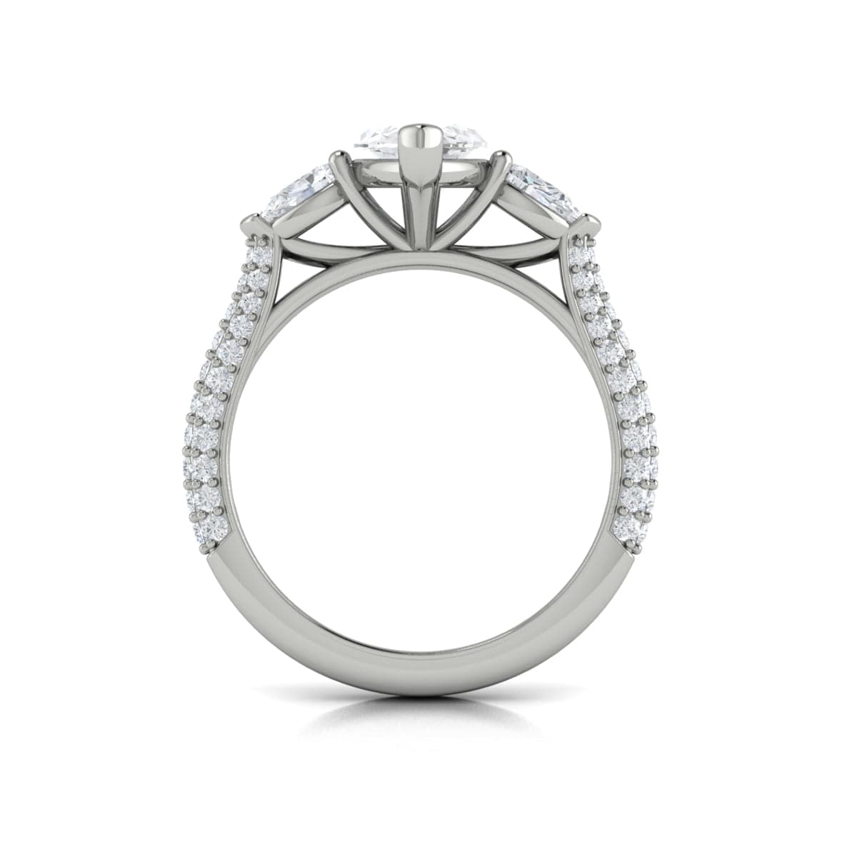 14K WG 3 STONE ENGAGEMENT RING WITH .50CTW PEAR SHAPED DIAMONDS ON THE SIDE AND .48CTW OF ROUND BRILLIANT 3 SIDE MICRO PAVE ON THE BAND. BAND WIDTH 2.2MM