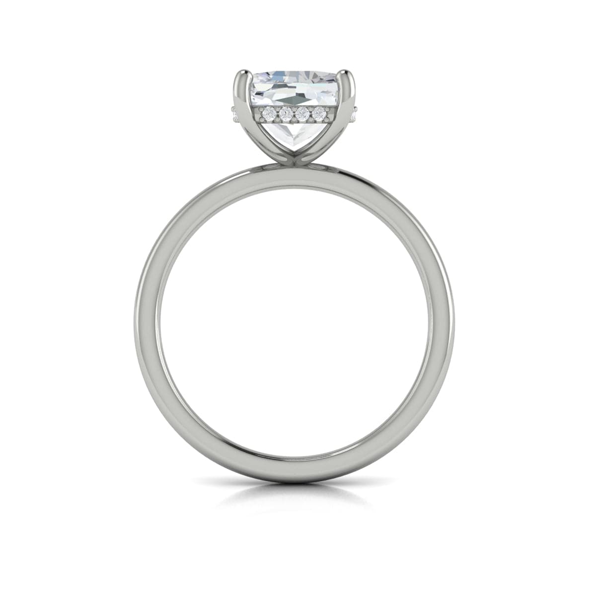 14K WG 1.5 MM BAND SOLITAIRE ENGAGEMENT RING WITH UNDER HALO FEATURING 0.06TCW OF ROUND BRILLIANT DIAMONDS.