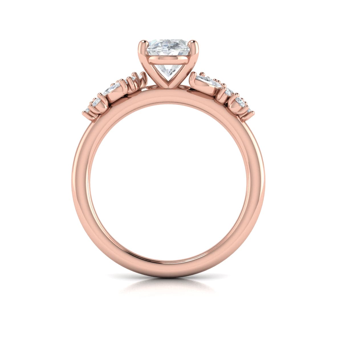 Unique Oval Cut Diamond Engagement Ring with vine like diamond detail set in 14k rose gold. The setting has ALTERNATING MARQUISE AND ROUND BRILLIANT DIAMONDS to create vine like detail on either side of the main stone. total Marquise = 0.20TCW total round brilliant BR=0.17 TCW 1.8MM BAND WIDTH. This style is available in all diamond shapes and in white, rose, or yellow gold. - C002872