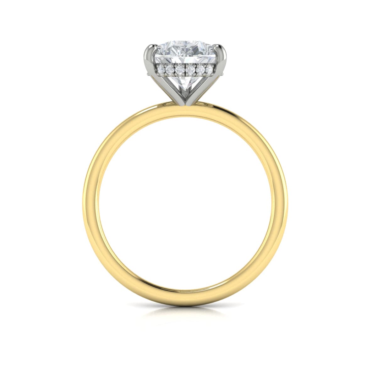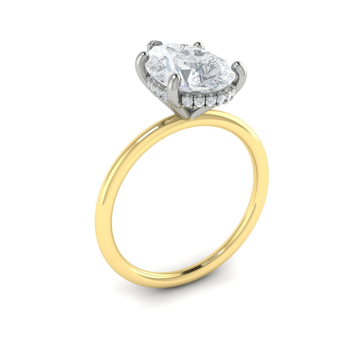 This elegant, pear-shaped solitaire diamond engagement ring features a diamond halo with a delicate 1.5mm band in a luxurious two-tone 14K gold mounting. Boasting a total carat weight of 0.08tcw, the white gold basket ensures the delicate prongs are discreet, giving the ring a sleek, sophisticated silhouette. A timeless homage to the beauty of diamonds, it exudes refinement and is available in yellow, rose, and white gold. Contact store for pricing in lab grown.