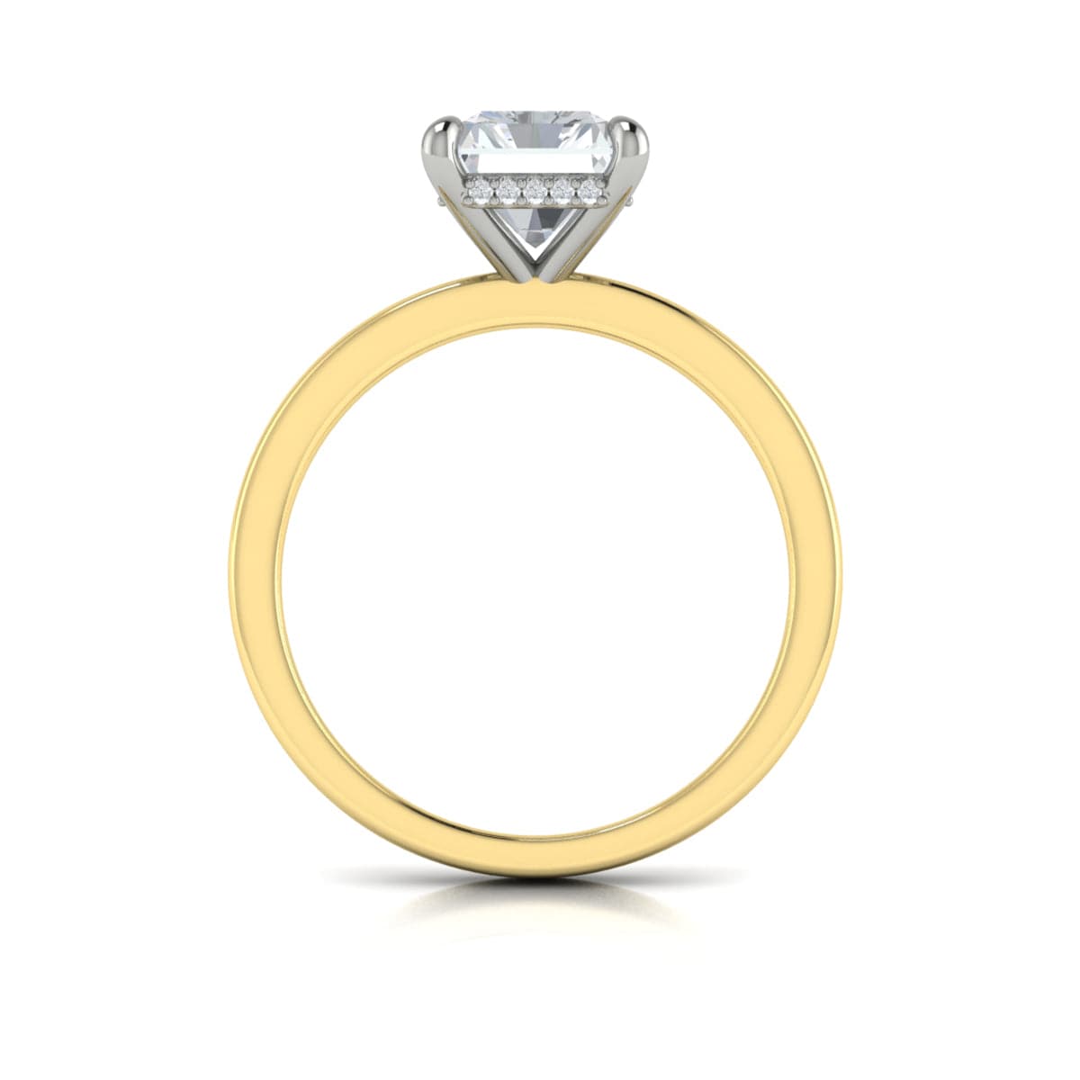 Radiant-cut Diamond Engagement Ring Solitaire boasting a glistening Diamond Under Halo set in an elegant 1.5mm two-tone 14K Yellow Gold band, complete with a sophisticated white gold basket that minimizes the prongs for a sleek, discerning look. This style is available in white, rose, or yellow gold, and can also be ordered with lab-created stones. Contact the store for pricing details regarding lab-created mountings.-C003512