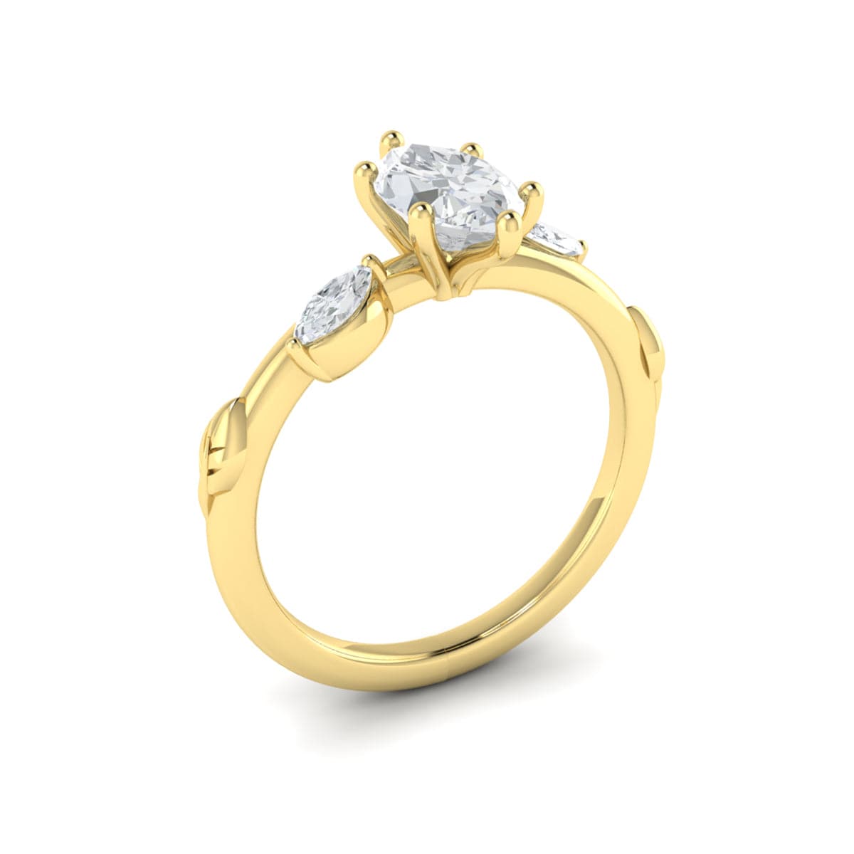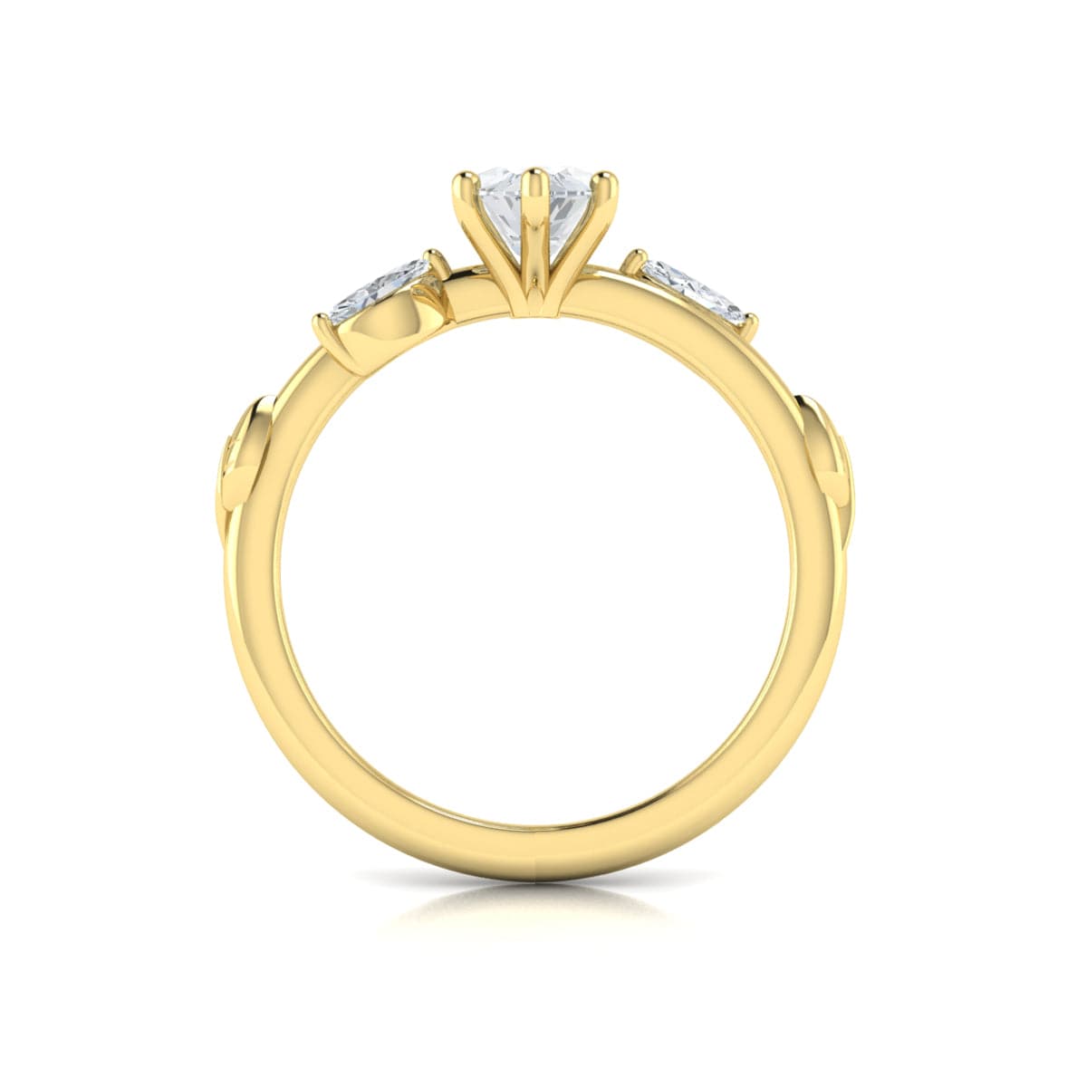 A one-of-a kind marquise diamond engagement ring entwined in a delicate 14K yellow gold band of 1.6mm, crafted with intricate vine detail. Each side of the main stone gracefully showcases two marquise diamonds, totaling 0.10TCW, set east to west for the perfect union of luxury and beauty.-C005346