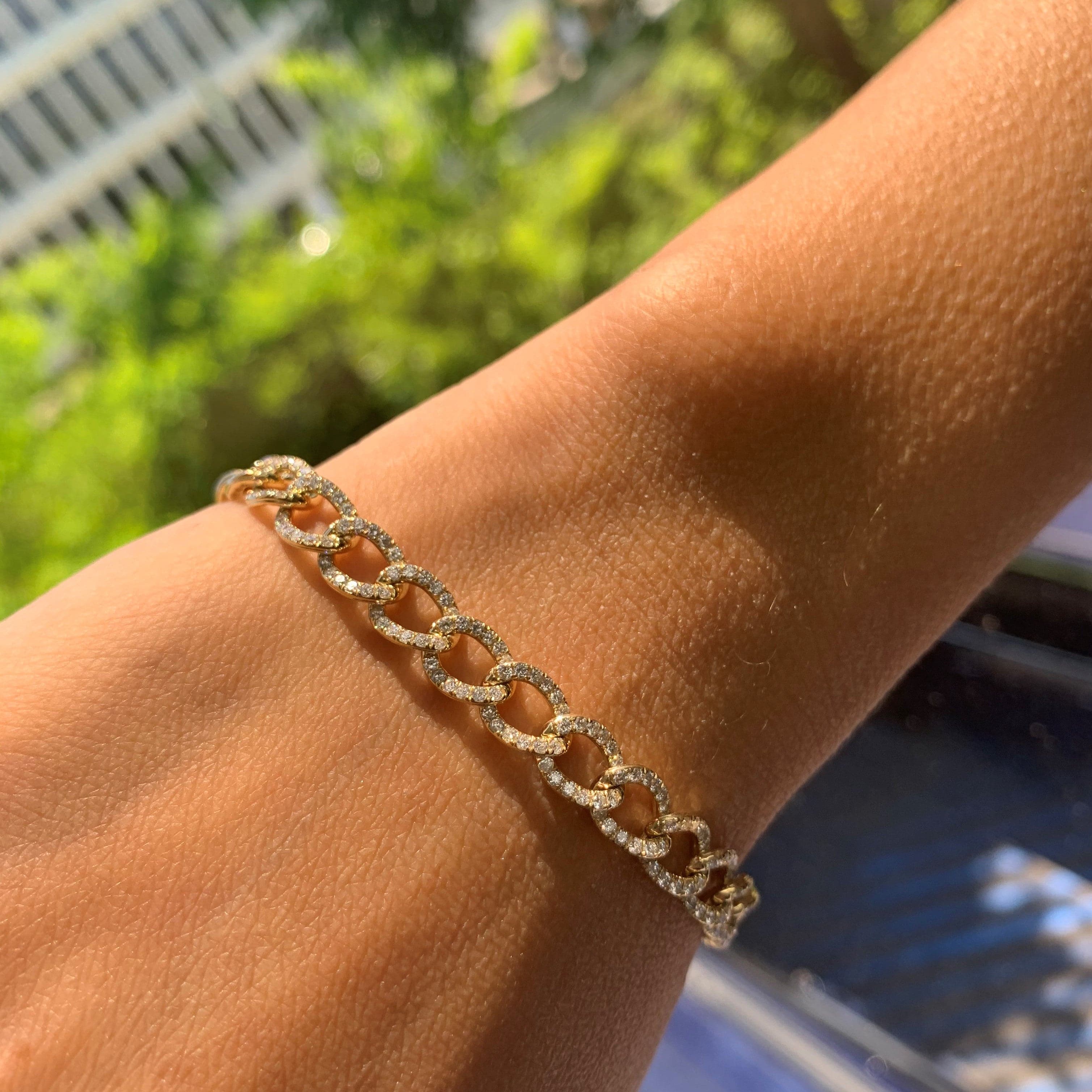 This Stunning Diamond Link Bracelet is crafted of 14K Gold and features 2.65 ct. of Round Diamonds. Diamond Color and Clarity is GH-SI1. 7" Length, with safety latch closure.