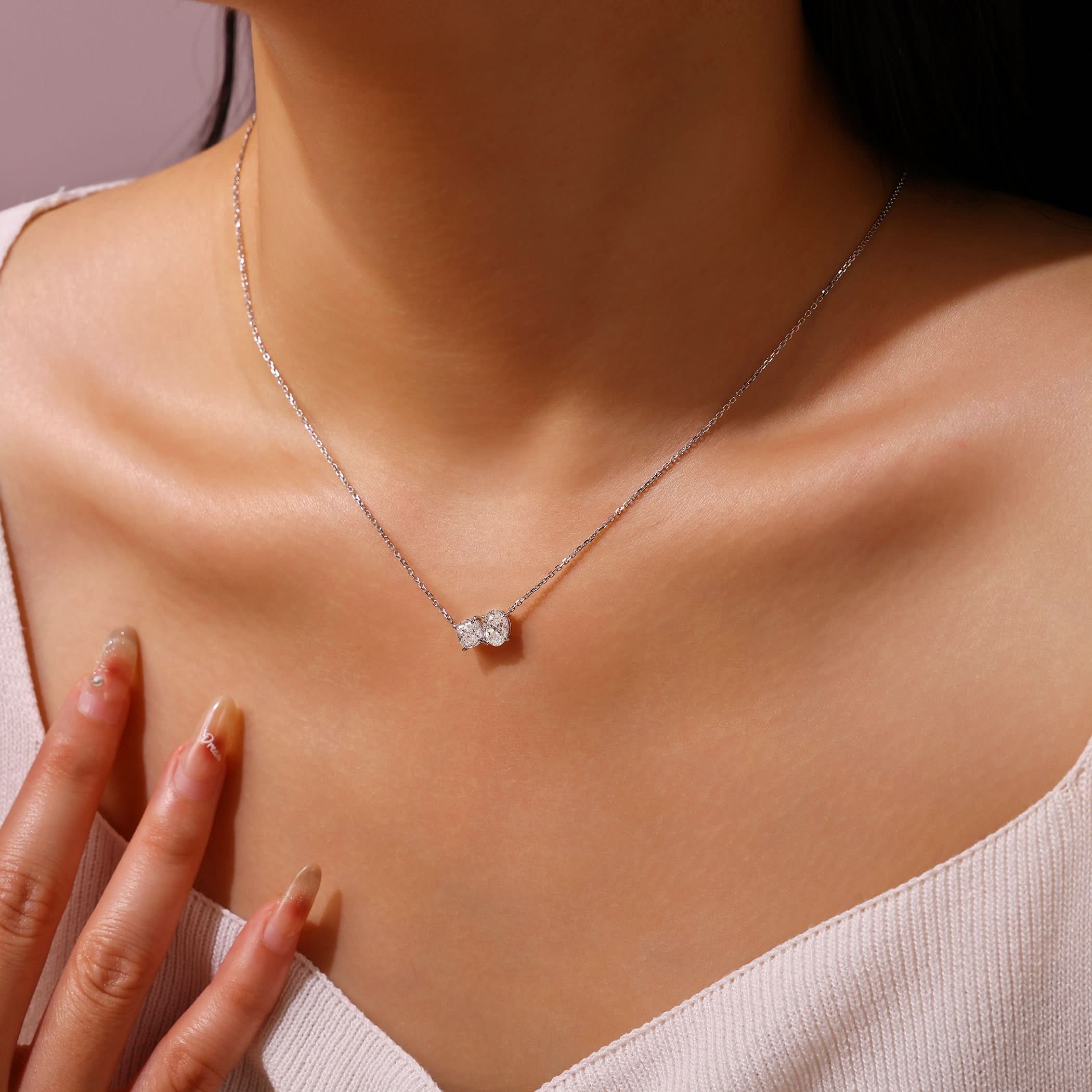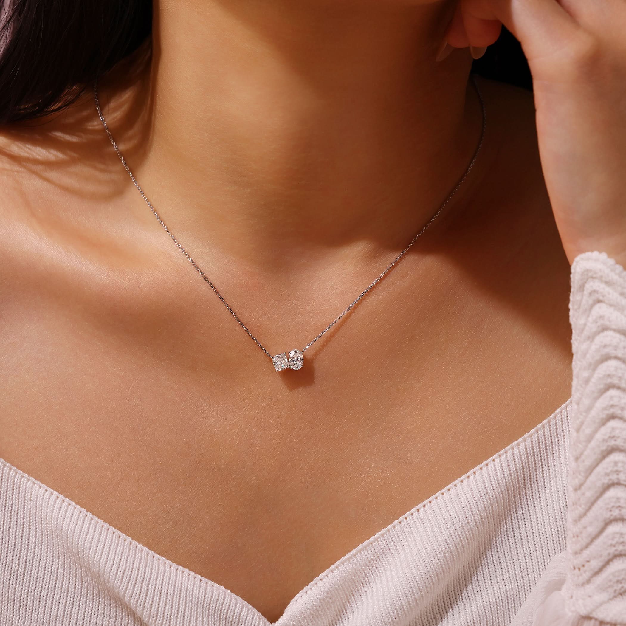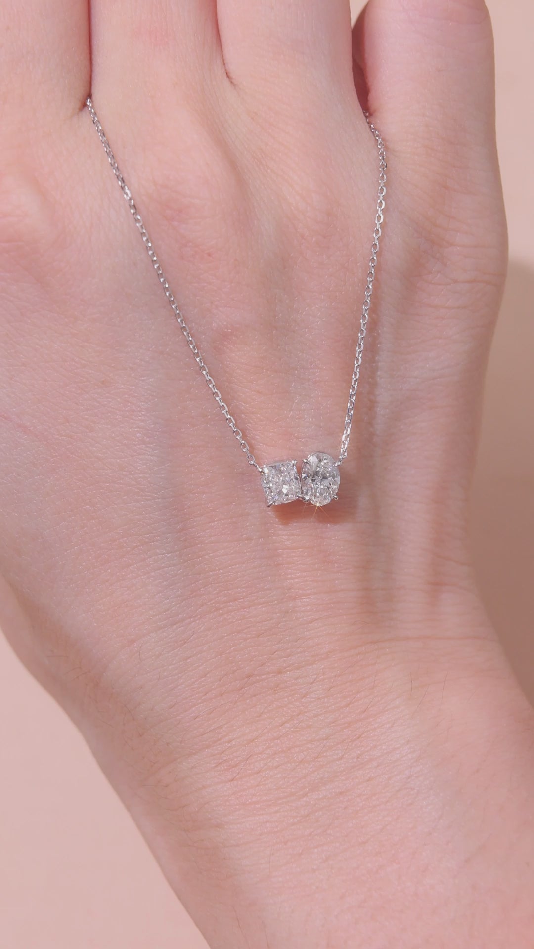 This stunning "Toi et Moi" pendant necklace features a harmonious pairing of an oval and a cushion-cut diamond, symbolizing the union of two unique yet complementary elements. Totaling 1.33 carats, the diamonds are set in sleek 14k white gold, allowing their brilliance to shine with elegance. The delicate chain enhances the simplicity and sophistication of the design, making it a timeless piece that beautifully represents love and connection. Perfect for everyday wear or as a meaningful gift, this necklace is a modern classic.