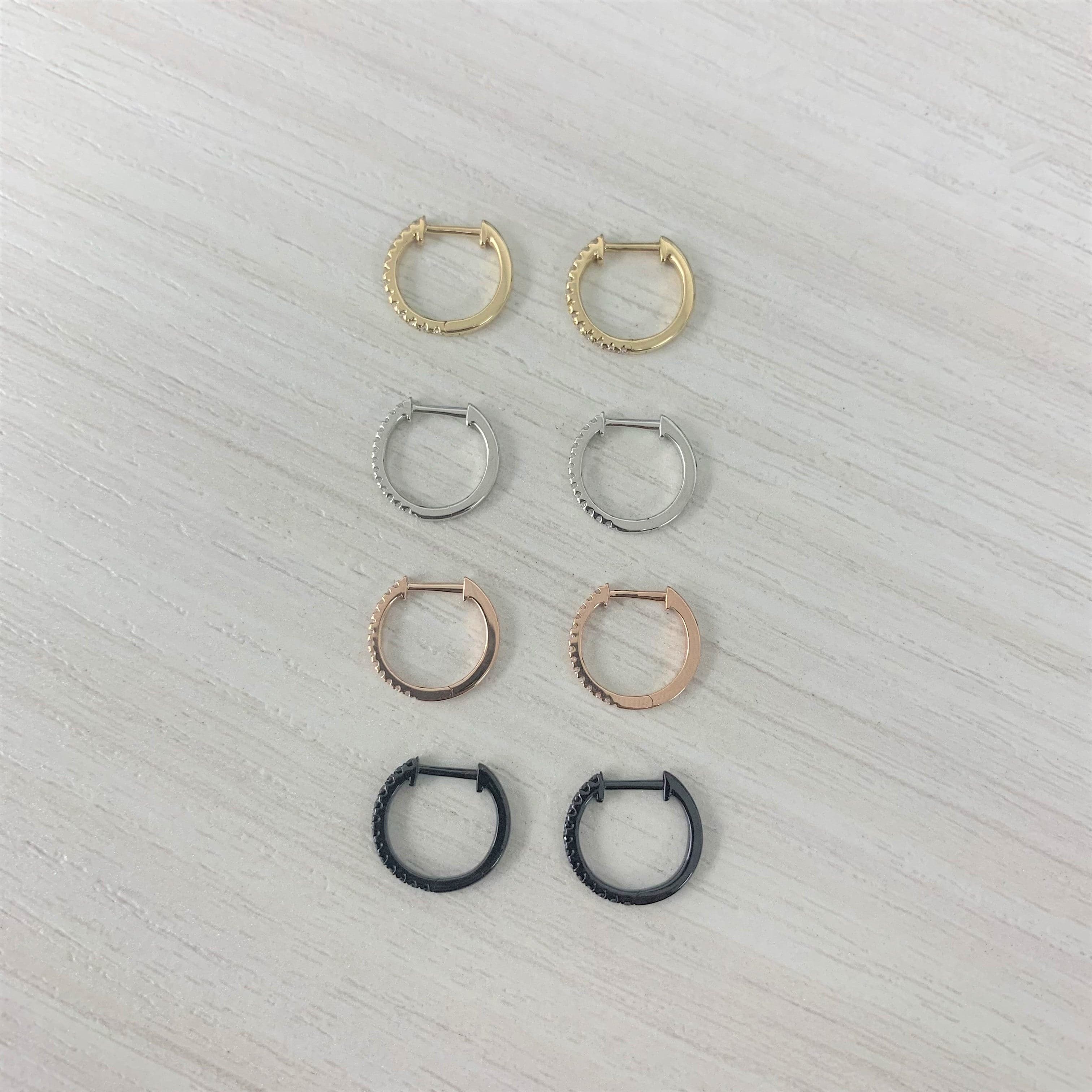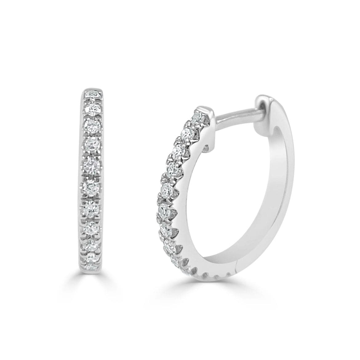 Simple yet stunning, these Diamond huggie hoops are crafted from 14k gold with 13 glittering white 0.09 ct. of diamonds. Each delicate U-shaped hoop features a single line of white diamonds, pave-set across the face in a gorgeous display. 1/2" in diameter.