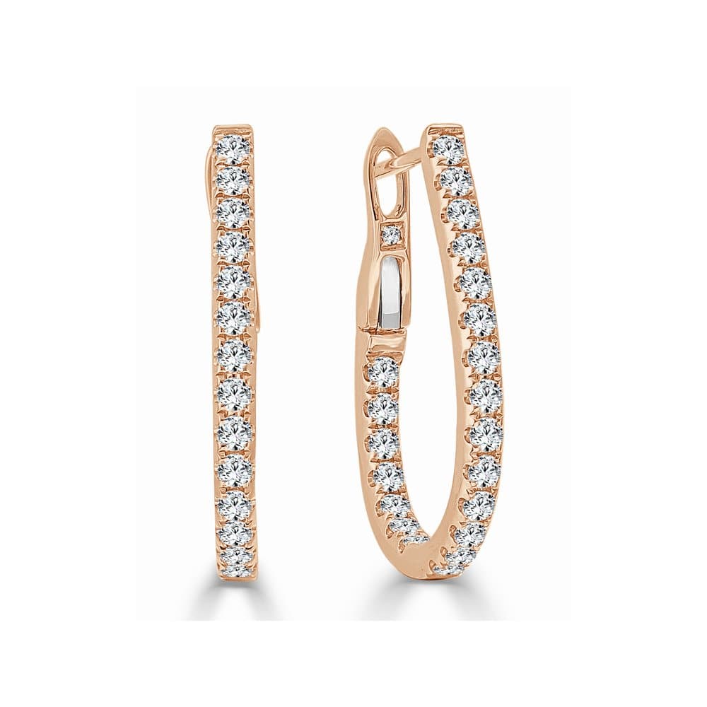 14K Gold Inside-Out Diamond Pear Shape Hoop Earrings featuring approximately 0.65 ct. of round diamonds. Diamond Color & Clarity is GH-SI. Earrings Measure 3/4" Inches. Available in White, Yellow & Rose Gold.