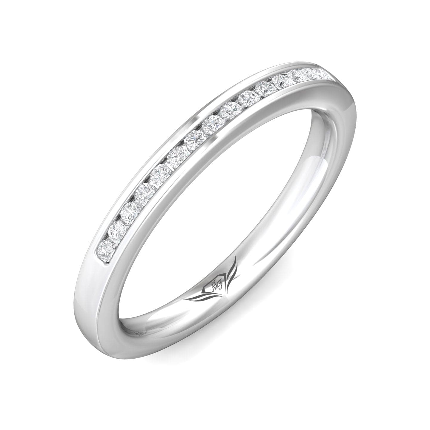 The shimmering channel set diamonds in this elegant FlyerFit wedding band designed to maximize sparkle.