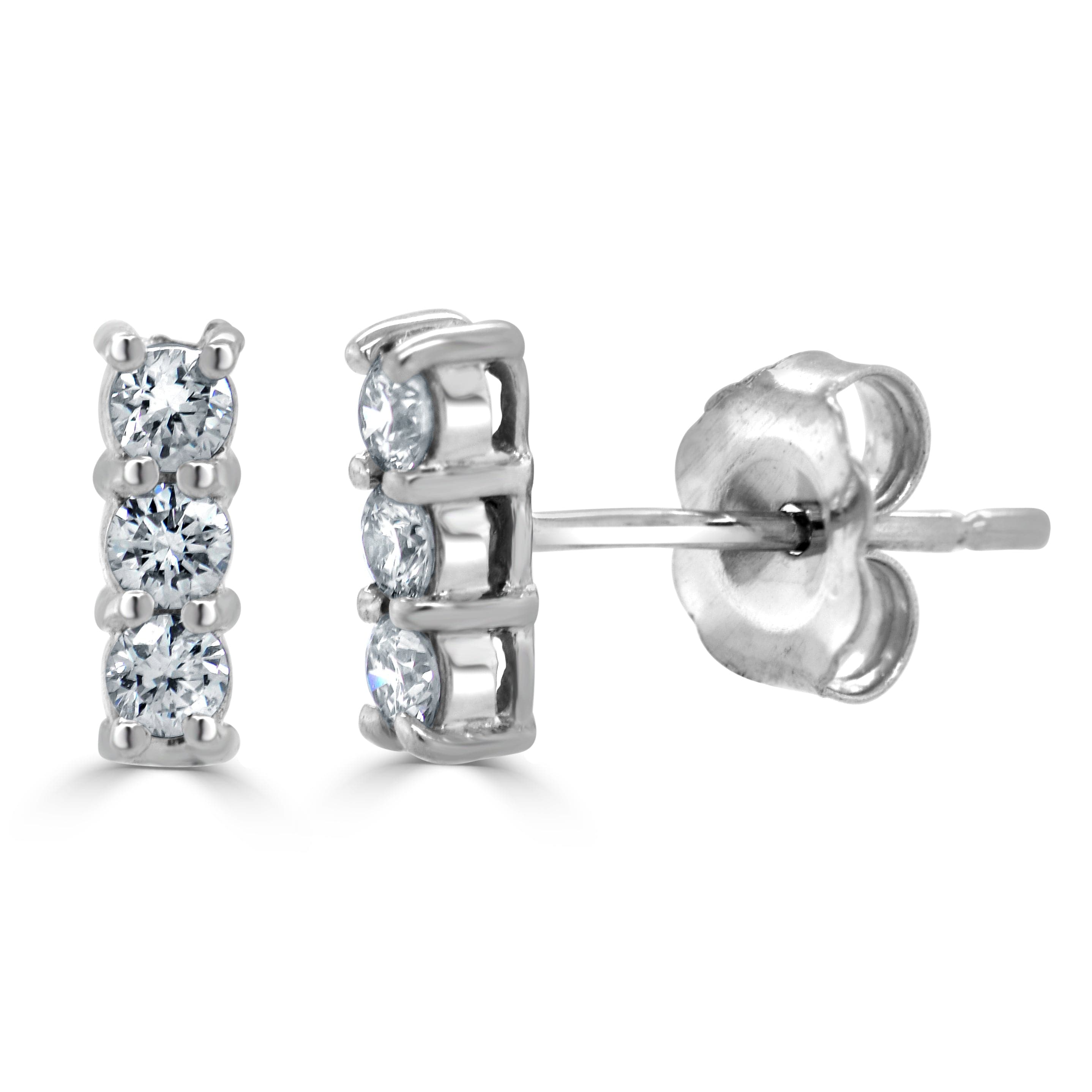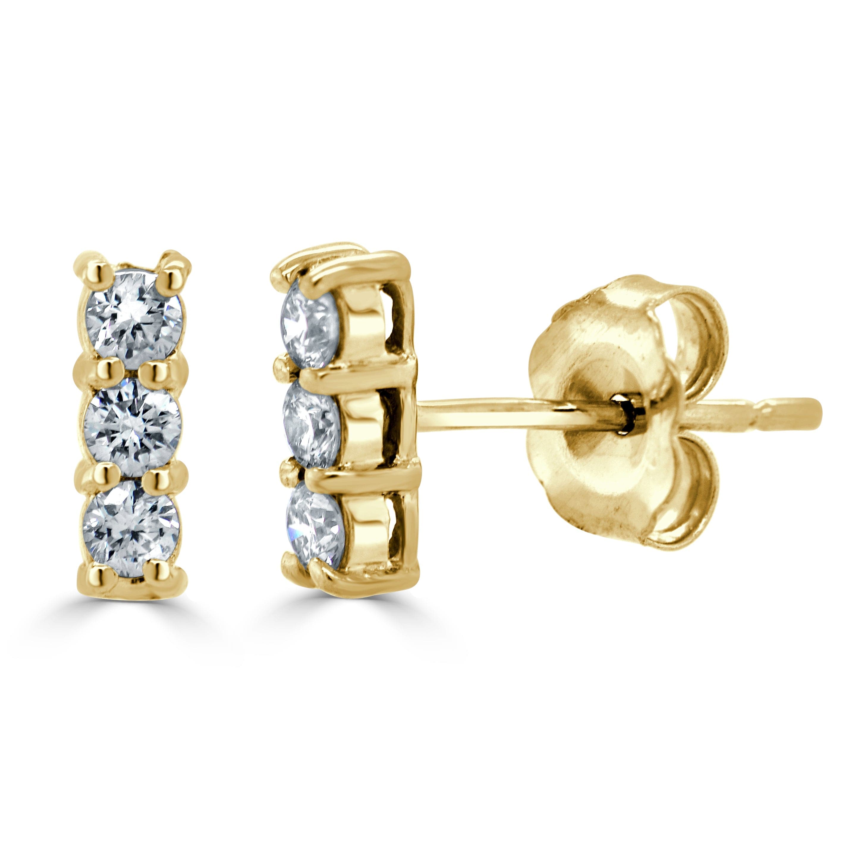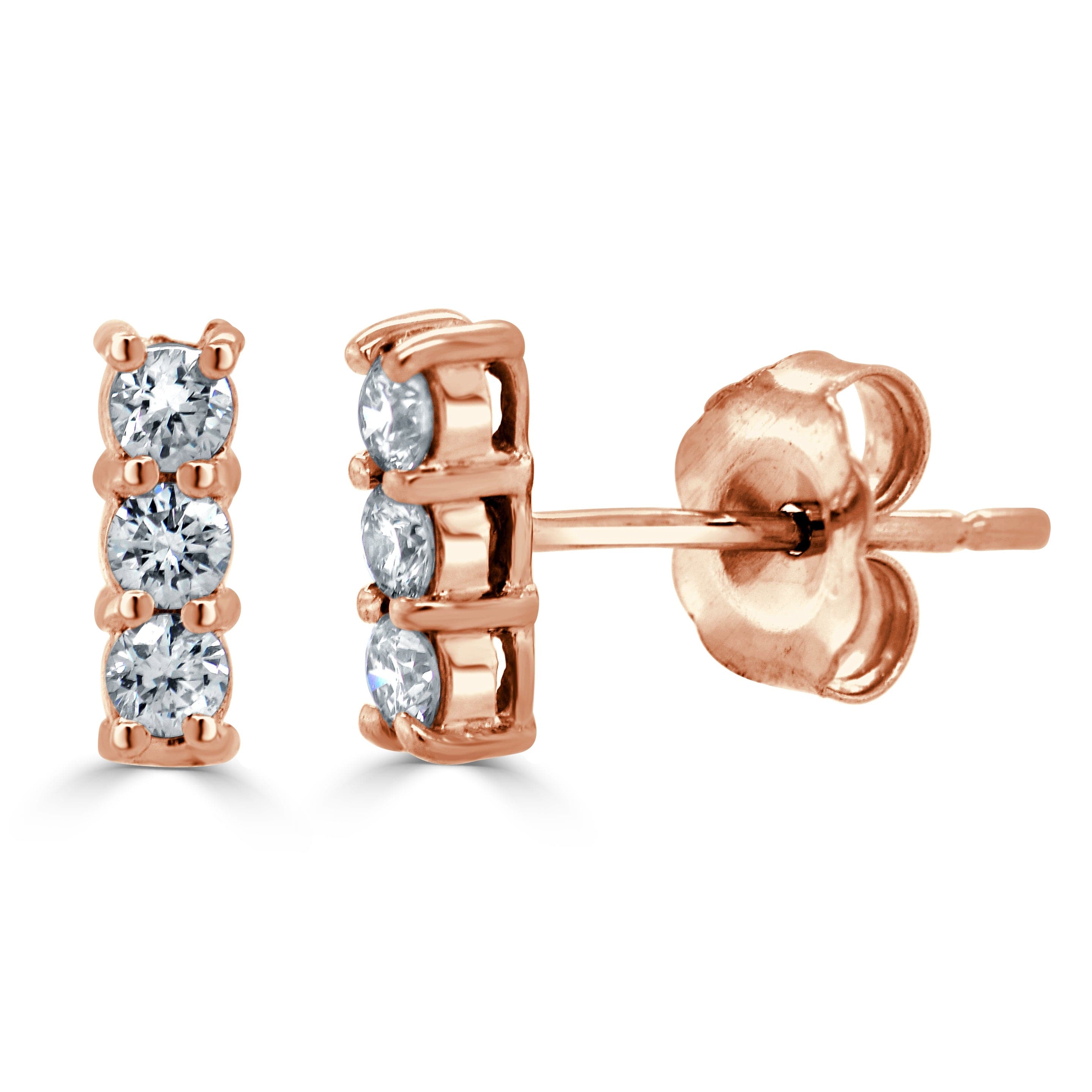 Crafted of 14K Gold these Classic and Pretty 3 Stone Diamond Bar Stud Earrings feature 6 Natural Round Diamonds weighing approximately 0.25ct. Diamond Color & Clarity is GH-SI. Butterfly Push-back closure. Available in White, Yellow & Rose gold.