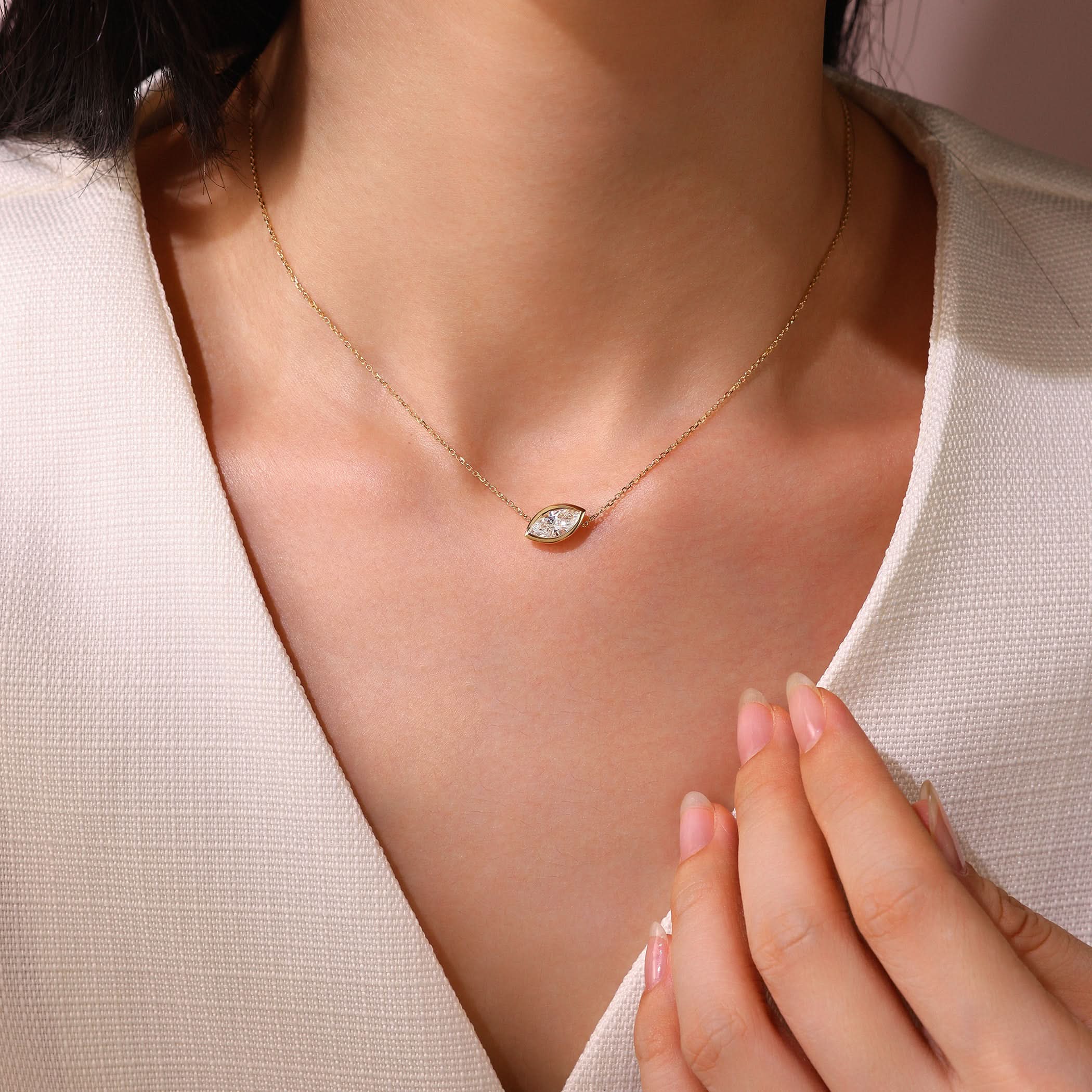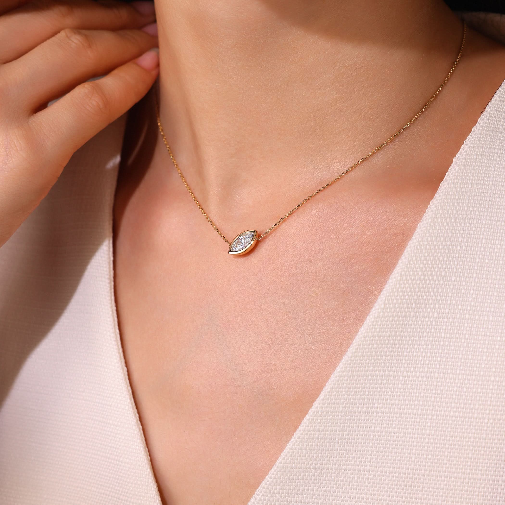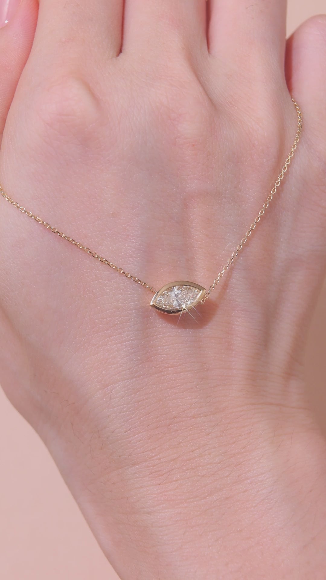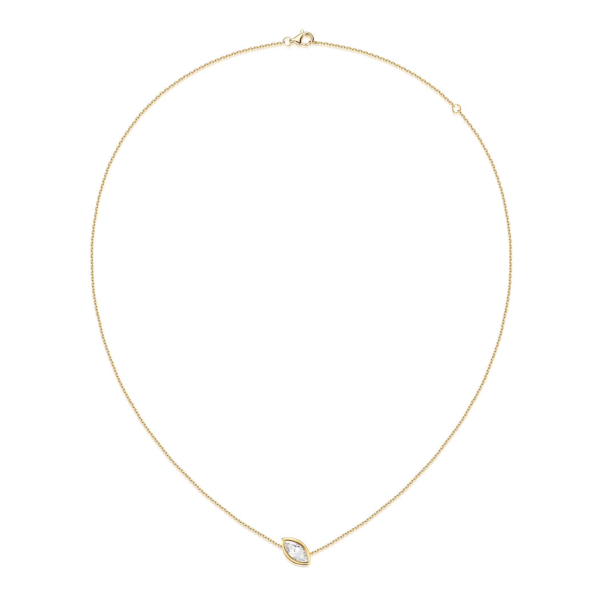This stunning necklace features a 1.01 carat marquise-cut diamond set in an elegant east-west orientation within a sleek bezel setting. Crafted in 14k yellow gold, the modern design highlights the diamond's elongated shape and enhances its brilliance. The warm gold setting adds a touch of sophistication and complements the diamond's sparkle beautifully. Suspended on a delicate gold chain, this pendant is a refined and versatile piece, perfect for everyday elegance or as a statement of contemporary style.