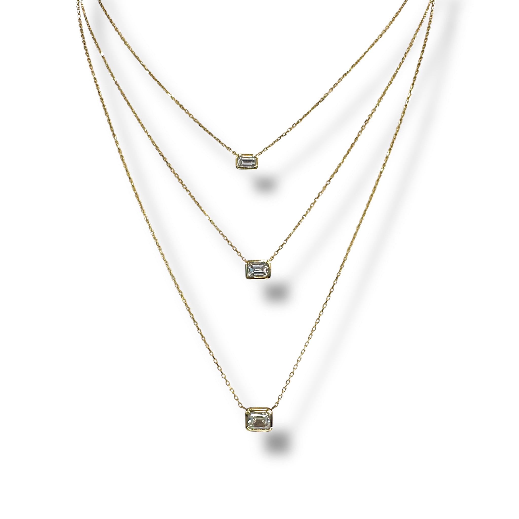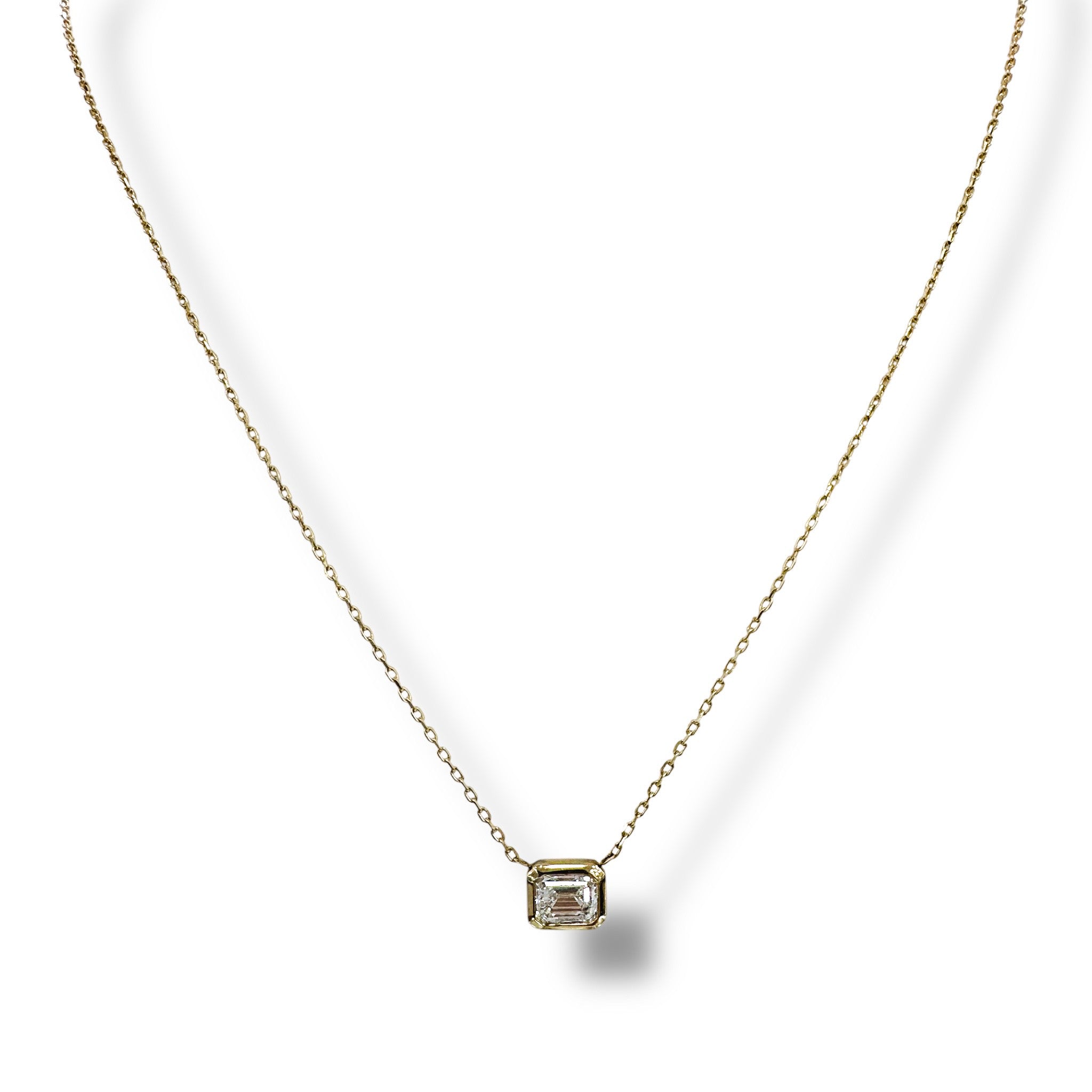 Sleek and timeless, these East-West bezel-set emerald diamond pendants are crafted in 14K yellow gold and feature horizontally set emerald-cut diamonds for a contemporary twist on a classic silhouette. The clean bezel setting frames each diamond beautifully while offering a secure, polished look. Available in multiple carat sizes, these minimalist pendants are perfect for layering or wearing solo as a subtle statement of elegance.