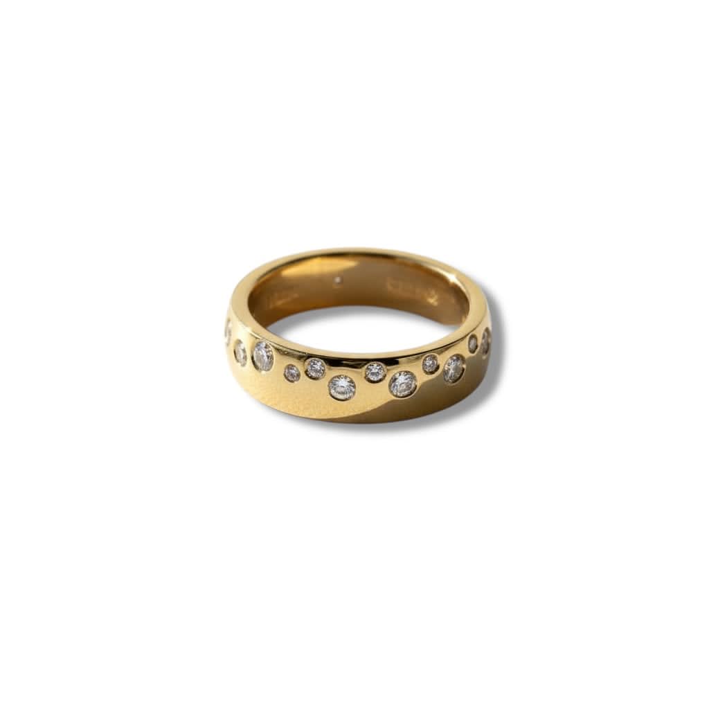 This 14k gold cigar band reimagines a timeless design with contemporary flair. The distinctive bubble motif showcases 0.62 carats of round brilliant diamonds, each precisely set to catch and reflect light with exceptional brilliance. The flush setting ensures a smooth, comfortable fit whether worn as a standalone statement piece or layered with other bands. Ideal for those seeking refined elegance with modern sensibility.
