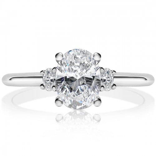 This engagement ring features an oval center and sidestones. A simple high polish band completes the look. Image features a 1.25ct center stone.