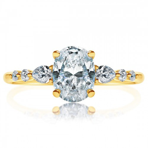 This engagement ring features an oval diamond center. Pear shaped diamonds rest on either side of the center, followed by two round diamonds. Image features a 1.25ct center stone.