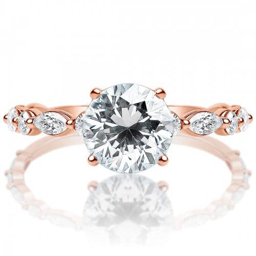 This engagement ring features a round diamond center stone. The band features round and east-west marquise diamonds set with shared prongs to give the ring a dainty look. Image features a 1.5ct center stone.