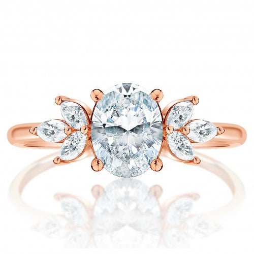 This engagement ring features an oval center. A cluster of marquise diamonds on either side create a floral look. A simple high polish band completes this elegant design. Image features a 1.25ct center stone.