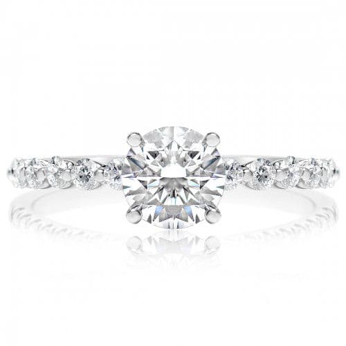 This engagement ring features a round diamond center stone. The band is comprised of round diamonds set with shared prongs, creating a bubble band design. Image features a 1ct center stone.